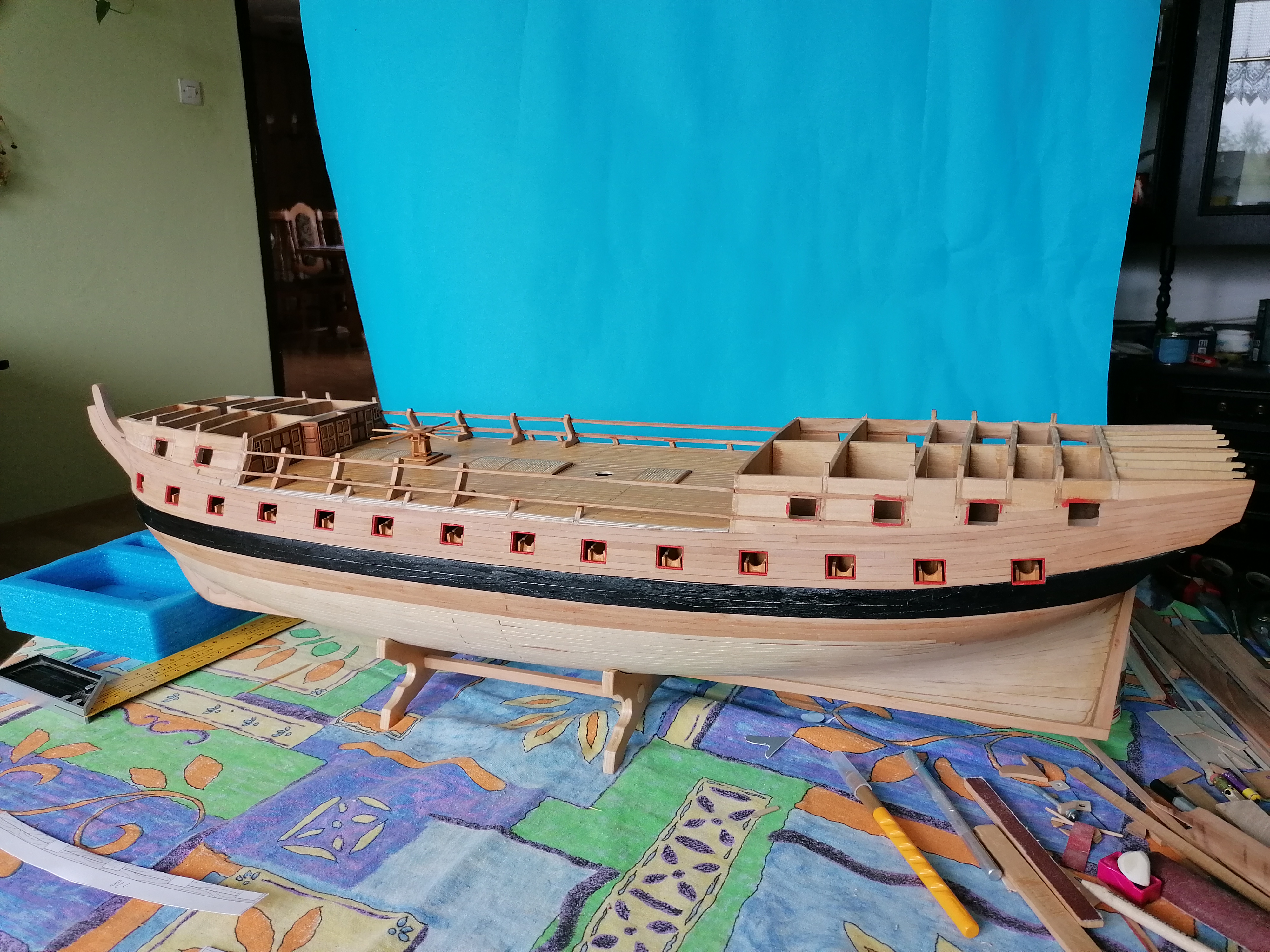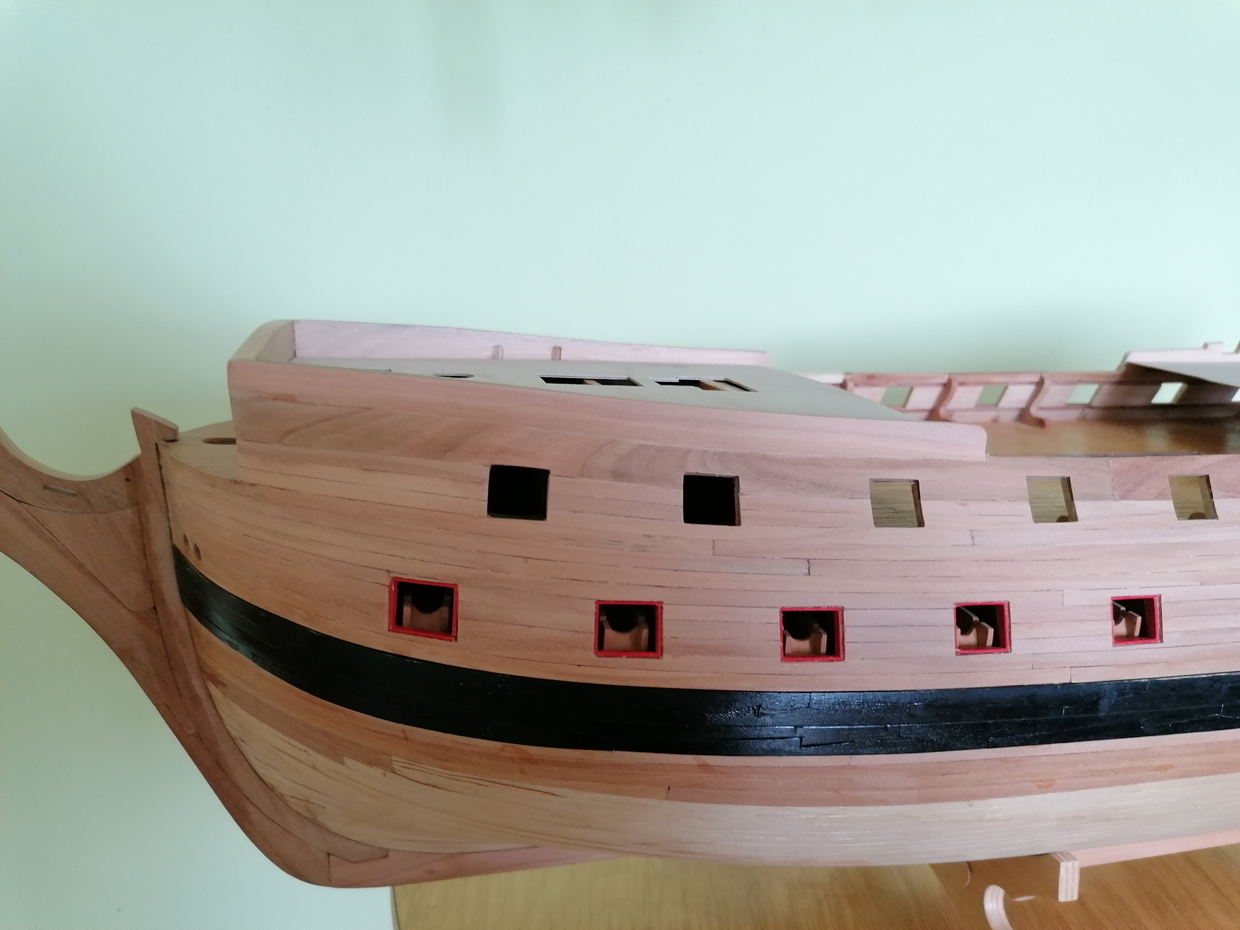 Przygotowałem sobie szablon z tektury i na jego podstawie wyciąłem z olchowej listewki o grubości 2,5 mm taką ściankę, która będzie jednocześnie wypełnieniem i podstawą do naklejenie planek poszycia rufy. Wkleiłem listewki wypełniające na wysokości drugiej linii furt działowych i przygotowane ścianki na dziobie i rufie modelu. Następnie wszystko przeszlifowałem i nakleiłem planki poszycia na razie tylko na lewej burcie. Na razie tyle .