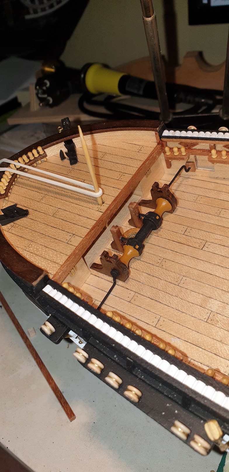 Schody/drabiny powinieneś poprawić - powinny być zamontowane bardziej pionowo - zauważ, że na załączonym przez Ciebie rysunku/planie ze str. 75, dolne końce schodow leżą tuż obok ok. 1/3 długości tej krótszej półki talrepowej z trzema naglami, podczas gdy w Twoim modelu są one bardziej ku rufie, tam gdzie w/w półka się kończy. Czyli leżą pod zbyt małym kątem. Jeśli zmienisz kąt ustawienia owych schodów, będzie wystarczająco miejsca dla w/w korb od kołowrotu.