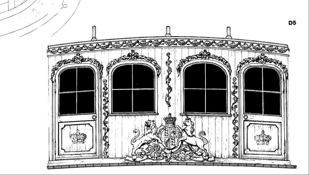 U podstawy kabiny jest belka, która jednocześnie spełniała taką samą role jak zrębnice przy lukach- zapobiega wlewaniu się wody. W tym przypadku przez (dołem) drzwi. Na tych planach ornament herbu prawie sięga pokładu.