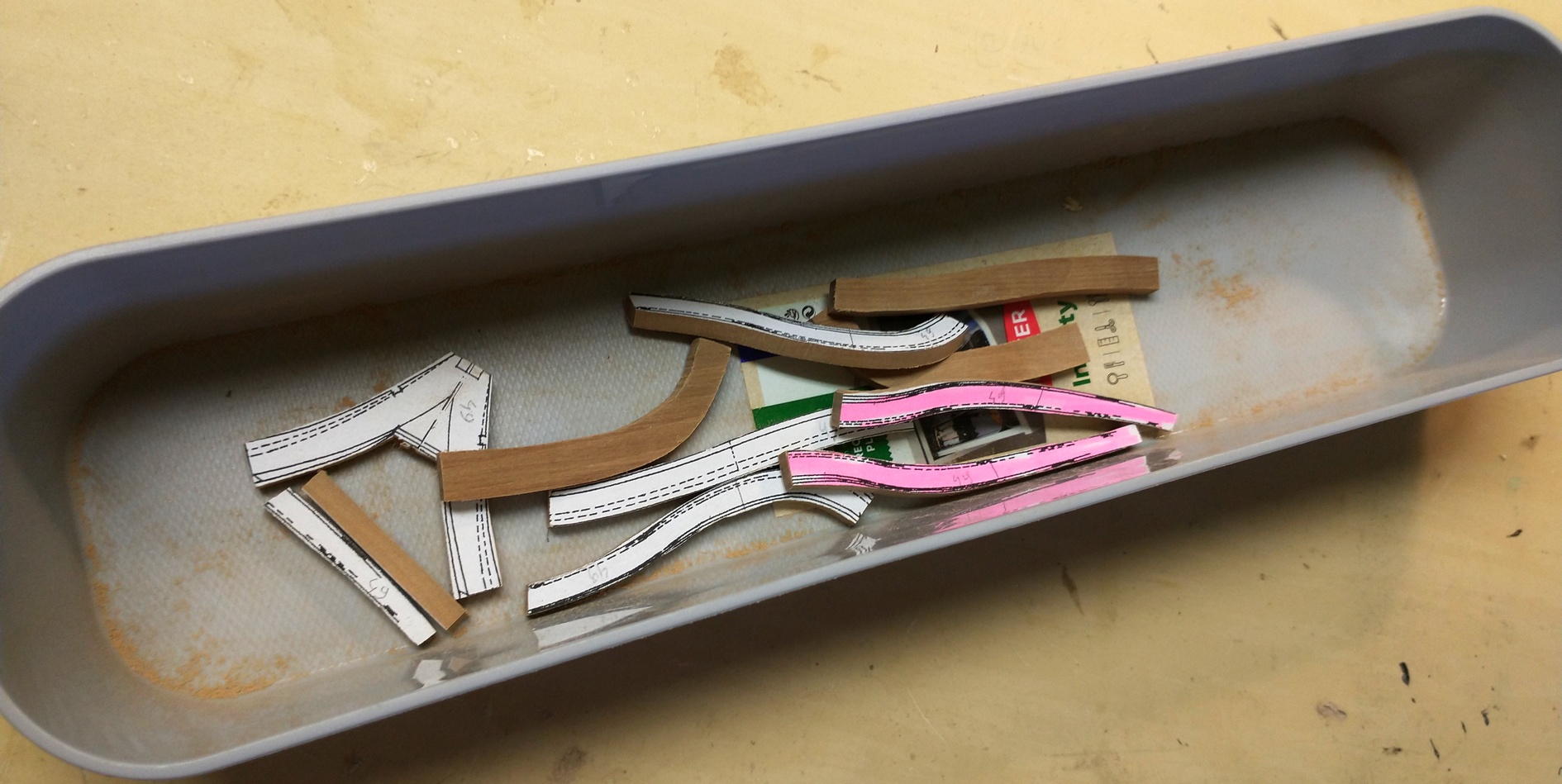 Prace idą szerokim frontem. Aby urozmaicić sobie pracę, równolegle wycinam, szlifuję i sklejam kolejne wręgi: