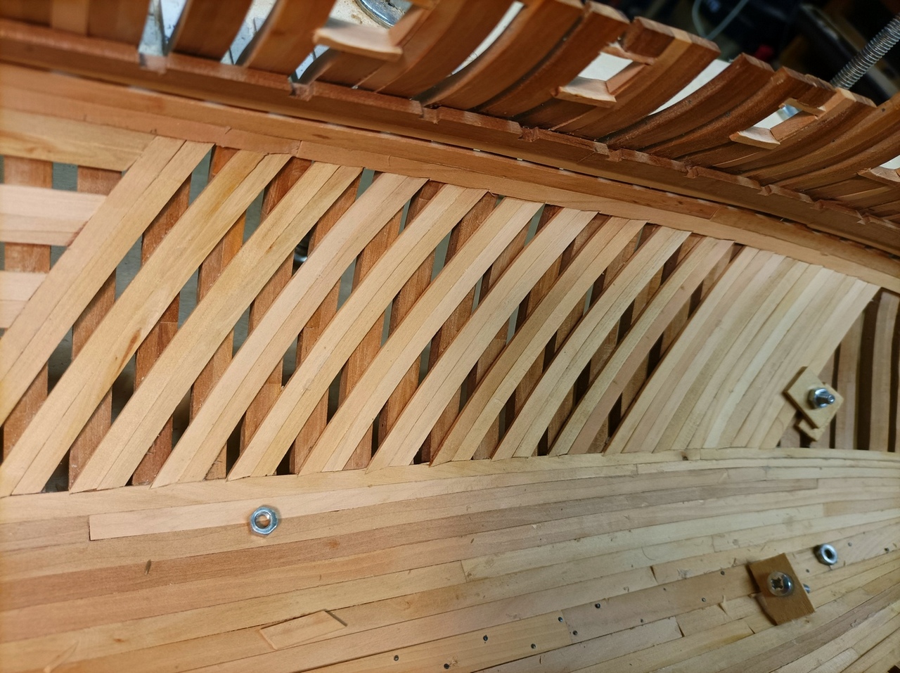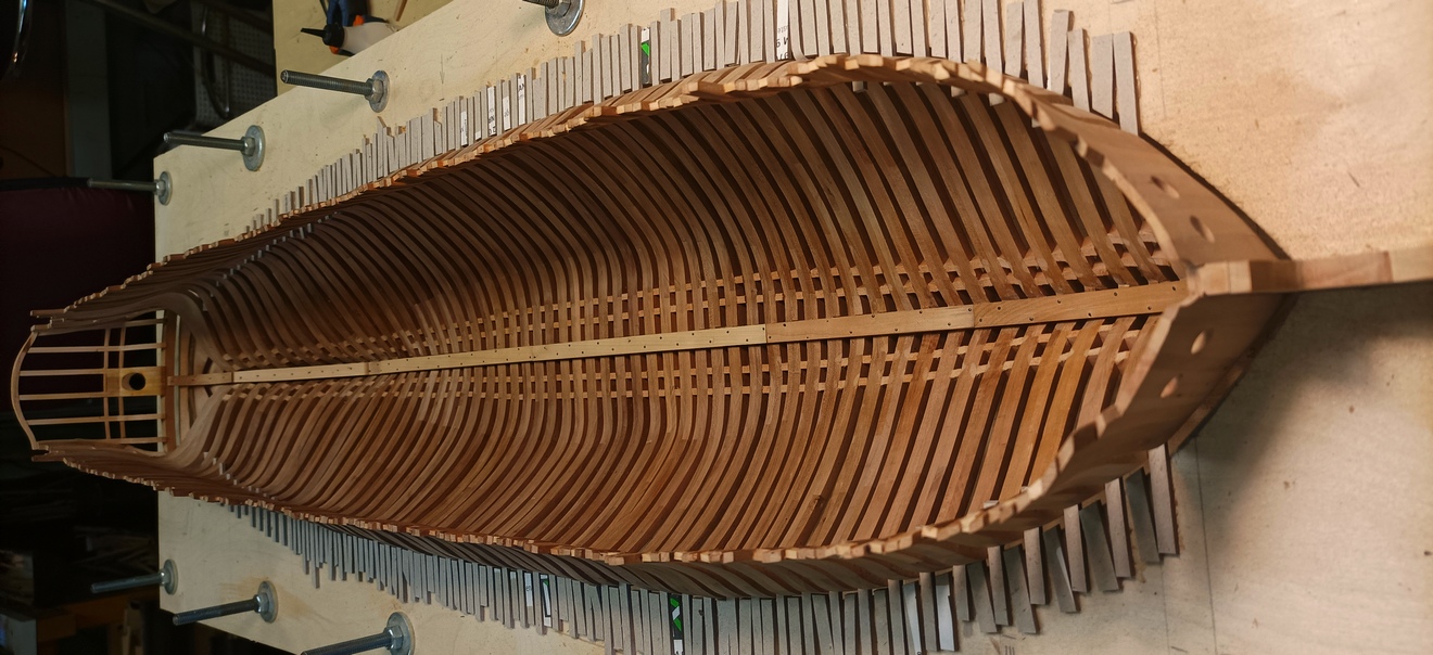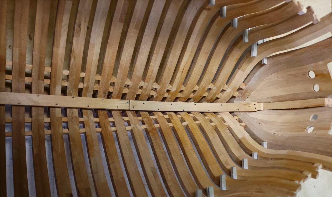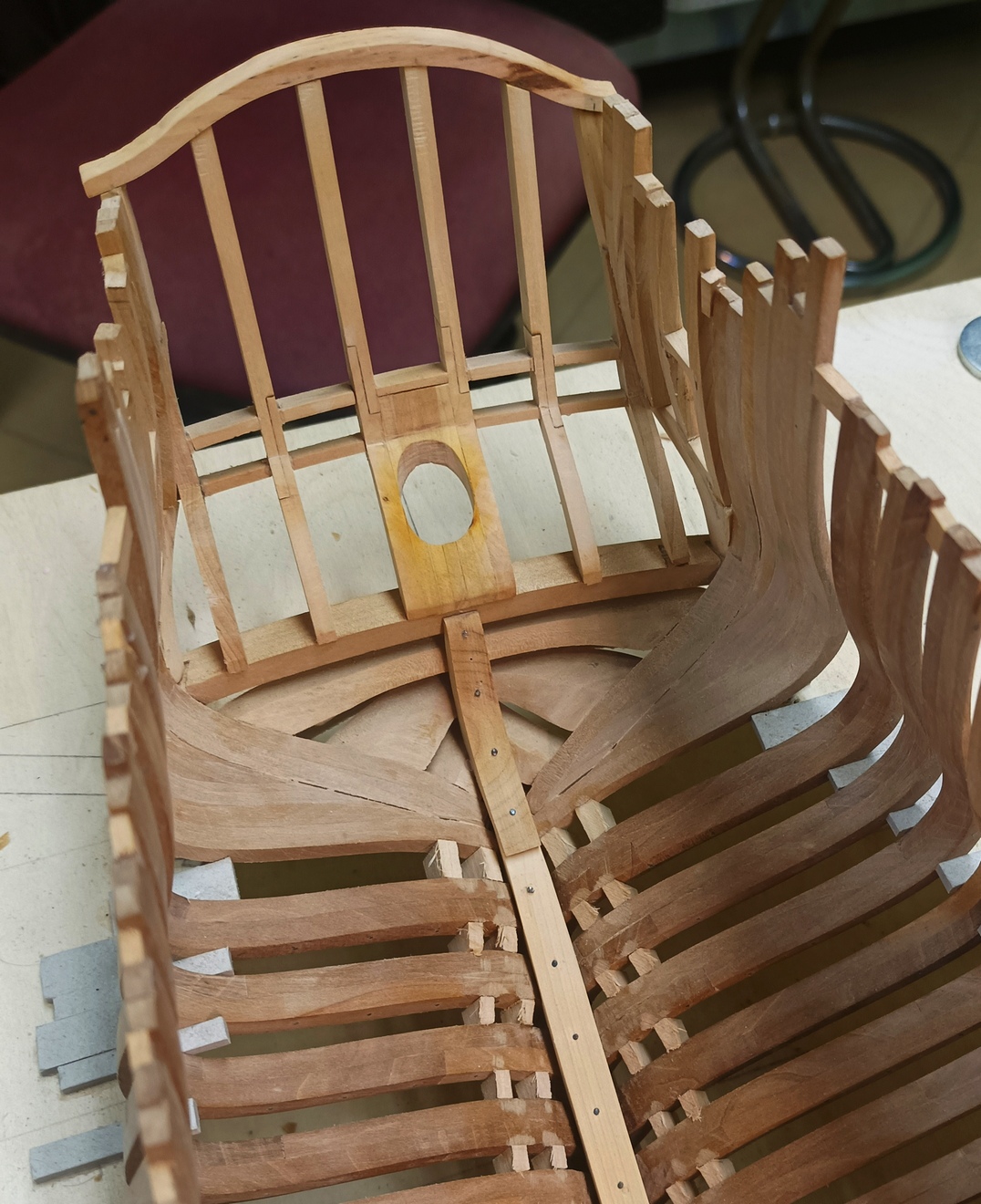 Po żmudnym kołkowaniu poszycia, przyszedł czas na wzmocnienia konstrukcji kadłuba, wraz z gniazdami masztów.