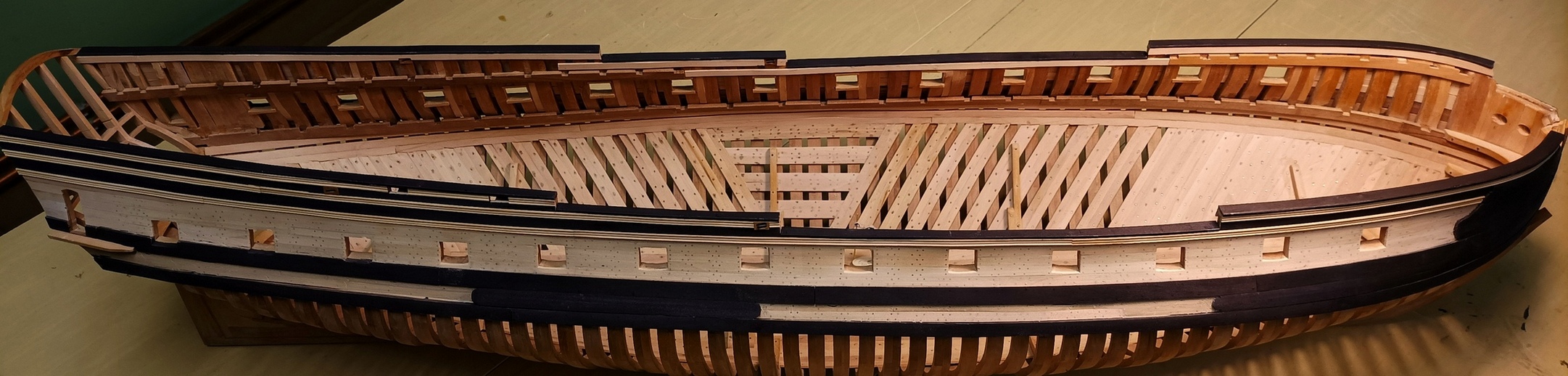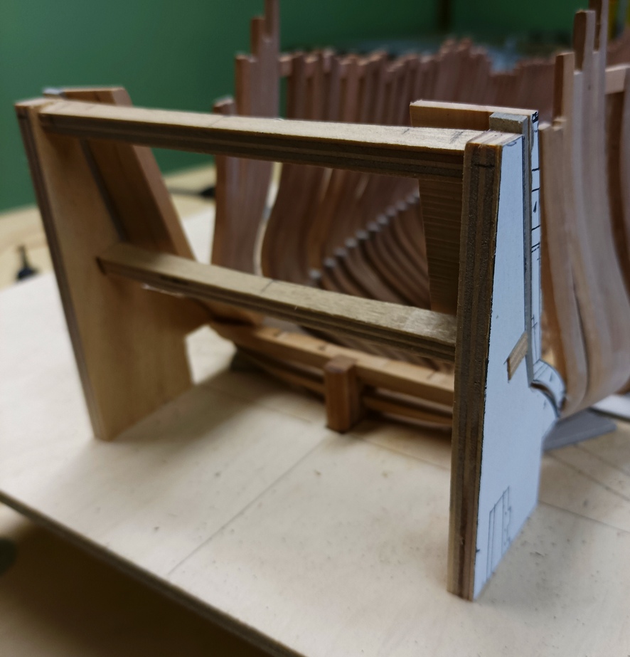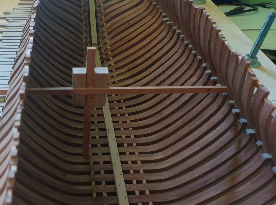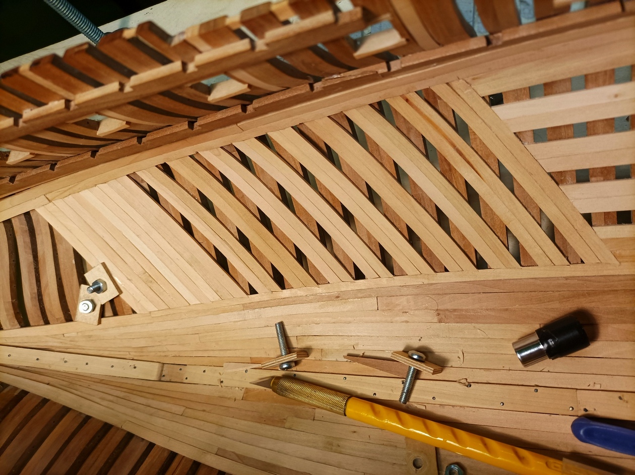 Po żmudnym kołkowaniu poszycia, przyszedł czas na wzmocnienia konstrukcji kadłuba, wraz z gniazdami masztów.