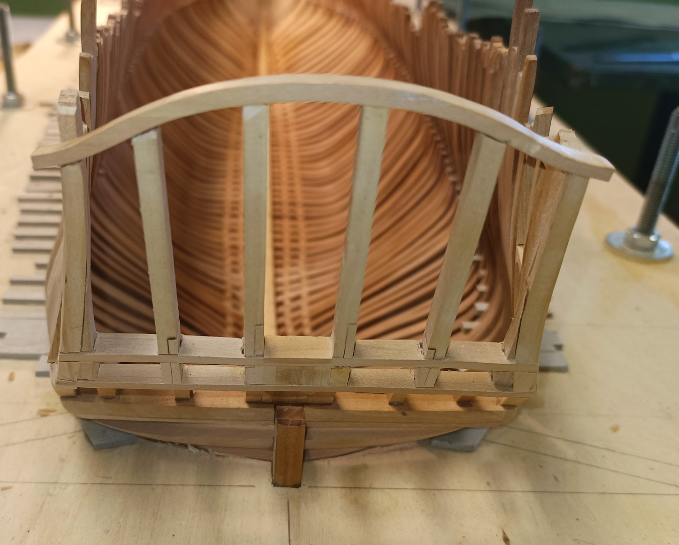 Doszły też listwy ozdobne na burtach i ławy nadburci. Ludzik w skali pokazuje ogrom tego okrętu.