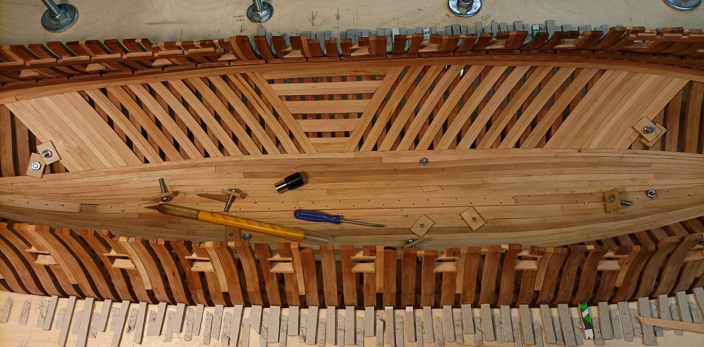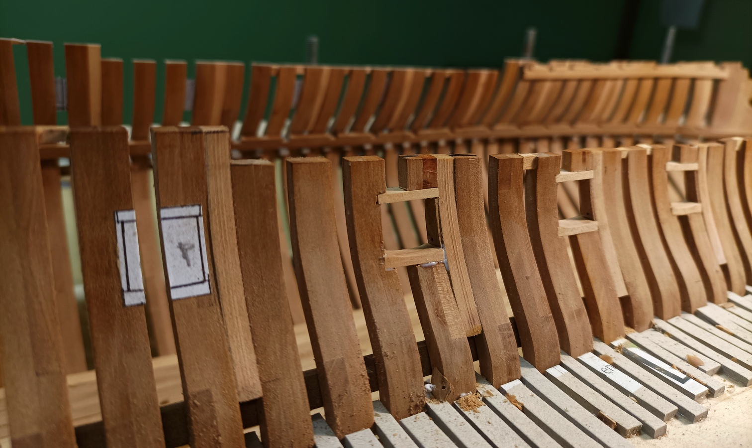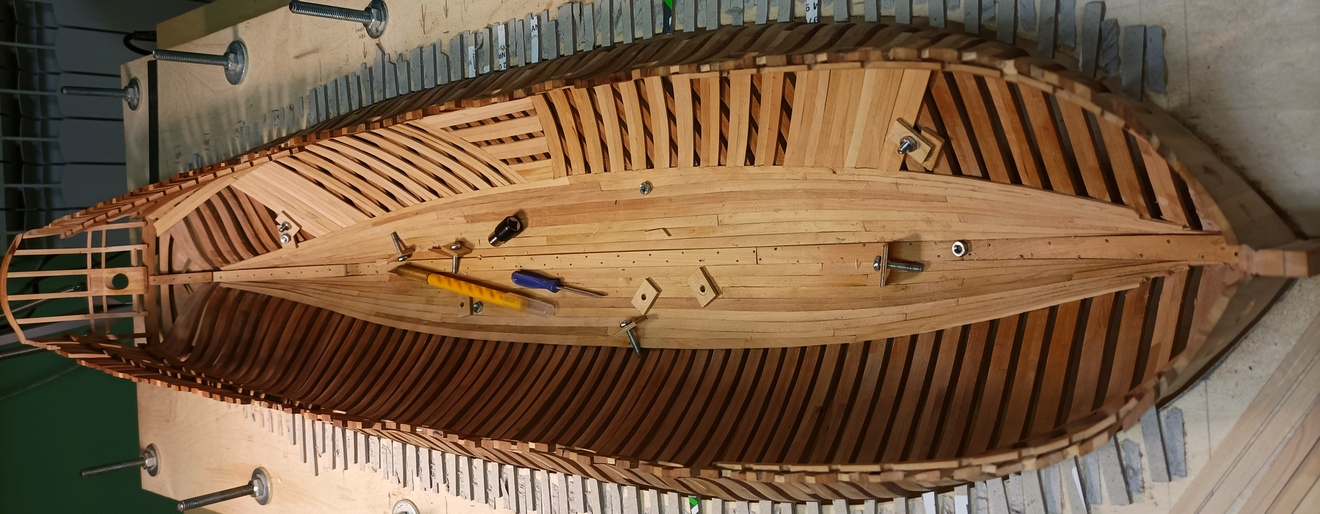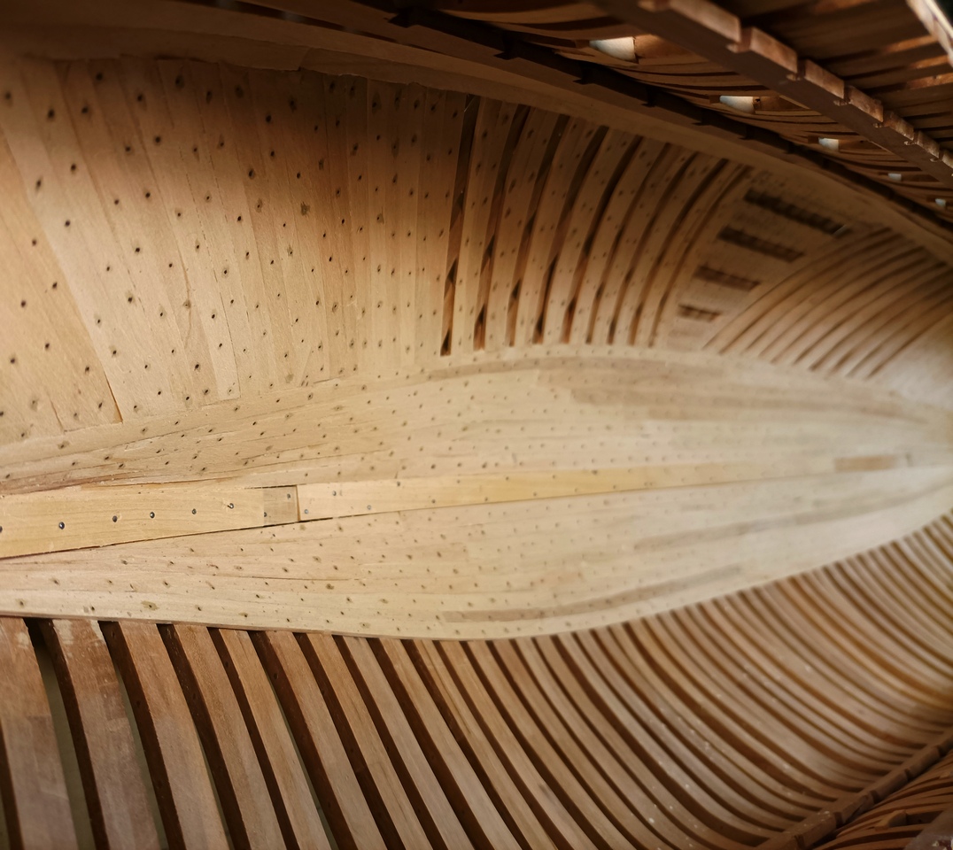 Po żmudnym kołkowaniu poszycia, przyszedł czas na wzmocnienia konstrukcji kadłuba, wraz z gniazdami masztów.