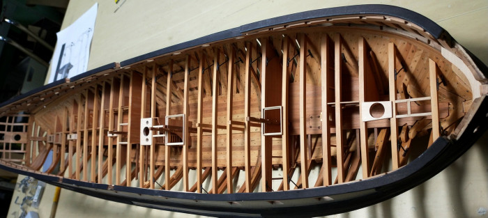 A poniżej kilkoro obiecanych ujęć wnętrza z dolnej perspektywy.Wzmocnienia pokładników wklejone. Trudne było to zadanie, lepiej było by użyć do ich montażu gwoździ lub nitów, ale z racji braku miejsca, trzeba było je ordynarnie wkleić.Można kleić powoli pokład.Tu też zamierzam użyć dwóch warstw forniru, ale tym razem brzozowego, by uzyskać jaśniejszy odcień.