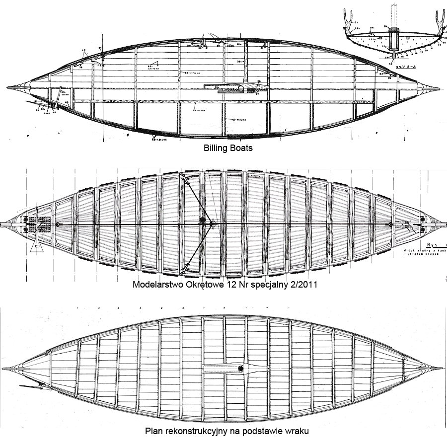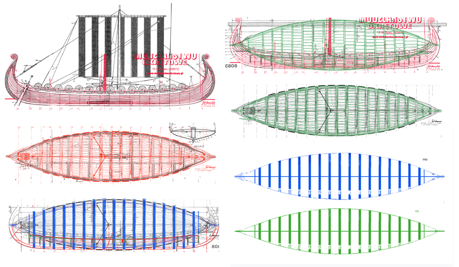 Budując drakkar opierałem się na planach łodzi z Oseberg dołączanych do zestawu Biling Boats. I te plany są też bazą do aktualnej budowy. Jednak są one trochę uproszczone, największy ich mankament to mała liczba wręg i ich umiejscowienie, nie odpowiadające oryginałowi. Chcąc maksymalnie zbliżyć się do rzeczywistej łodzi z Oseberg zacząłem więc kombinować z różnymi planami. W MO , 12 numerze specjalnym z 2011r. były plany łodzi wikingów, też bazujące na łodzi z Oseberg, jednak nieco odbiegające od oryginału. Publikowane plany rekonstrukcyjne oddają najwierniej to co powinno być … ale są najuboższe , brak linii teoretycznych, tylko kilka przykładowych wręg.