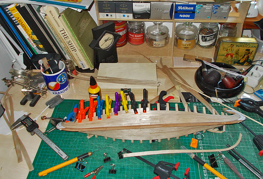 Etap poszywania kadłuba. Przy okazji można podziwiać moją gemele na biurku :lol: