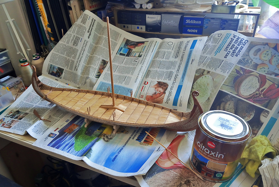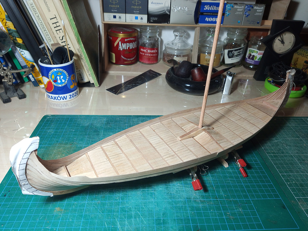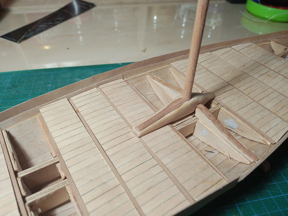 Trochę zaniedbałem relację, czas nadgonić. Poszycie kadłuba gotowe, czas położyć pokład. Tutaj taka ciekawostka, przy bloku masztowym pokład się wznosi, tworzy się taki wał a środku pokładu.