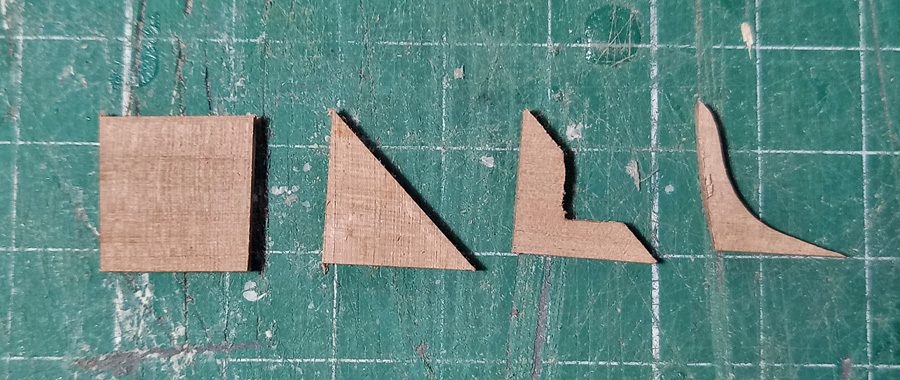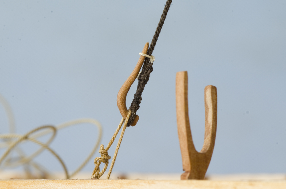 Kolejne duperele, które trza było wyrzeźbić to ściągacze. Ściągacze sztagu i achtersztagu to takie rogate cóś. Początkowo próbowałem wszystko wypiłować raszpelkami, ale nie wychodziło zbytnio. Więc zaangażowałem elektronarzędzia: najcięższy pręcik oklejony glaspapierem i najmniejszą tarczkę-piłę zębatą.