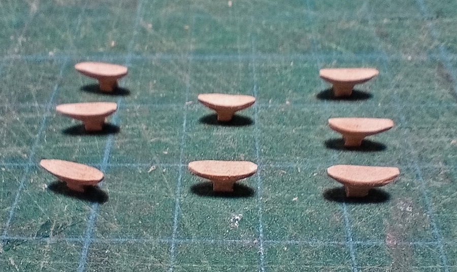 Kolejny etap prac to pocięcie pręta w poprzek na "plasterki" i dalej potraktowanie półfabrykatów knag raszpelkami i glaspapierem. I wyszło takie coś: