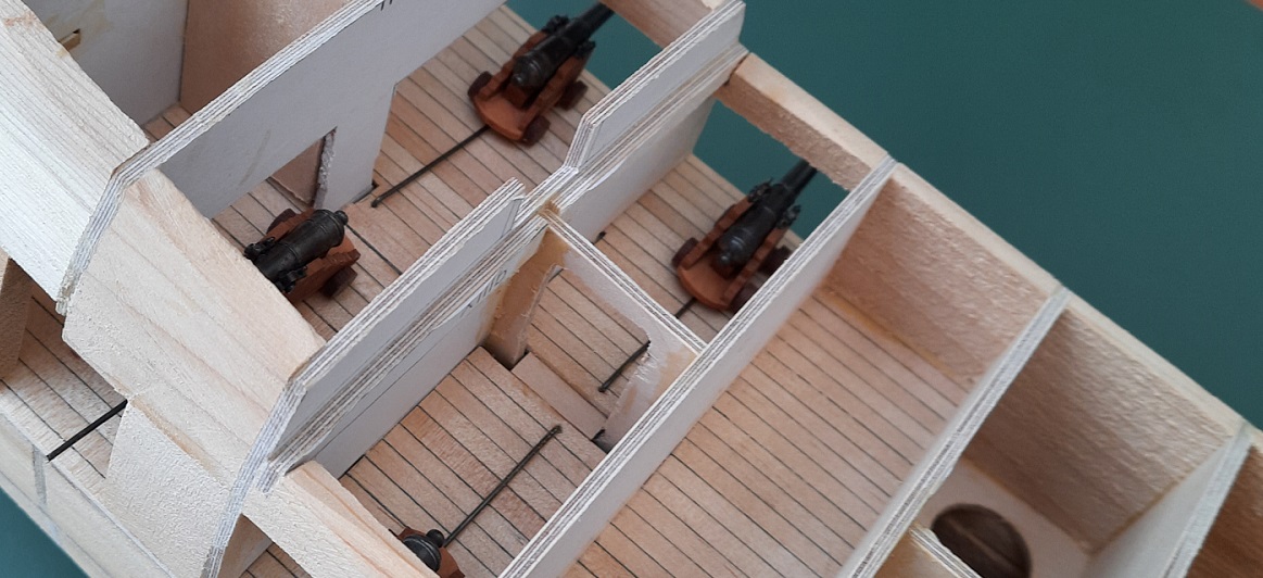 Armaty przeważnie montowane są na modelu kiedy kadłub jest poszyty a na pokładzie stoi większość elementów wyposażenia. Nie będzie tak jednak w moim modelu. Poszły na pierwszy ogień bo trzeba je schować na dolnym pokładzie. Aby nie przeszkadzały w trakcie budowy wykombinowałem że będą zamontowane i chowane na prowadnicy. Wyciągnięte będą dopiero po wykonaniu poszycia i położeniu pokładu górnego. Myślę że prowadnice których w rzeczywistości nie było nie będą widoczne bo światło dostaje się pod pokład w ograniczonej ilości jedynie przez otwory armatnie. jak to realizuję można zobaczyć na załączonych zdjęciach. Janek.