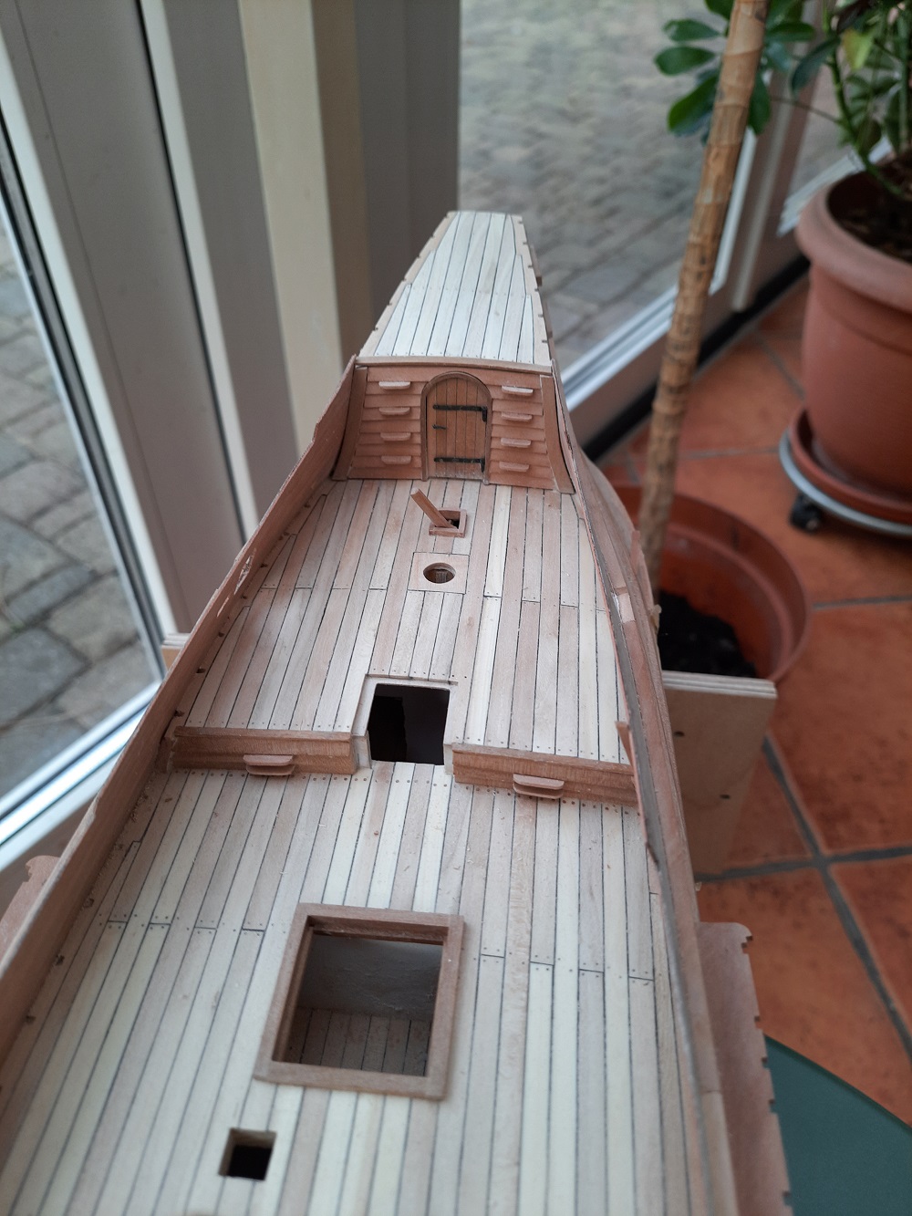 Przyszedł czas na drobnicę. Puki nie ma burt i jest dostęp do pokładu staram się przygotować co można już teraz by uniknąć później "gimnastyki". W Kruku zamiast schodów są "ścianki wspinaczkowe" - powtarzalne ale malutkie elementy. Malutkie są również okna a ich szklenie wykonałem z odpadów po moskitierze zalanych chińską farbą do malowania na szkle. Zawiasy drzwi są z blaszki grubości 0,3 mm i szerokości 2 mm. Udało mi się uniknąć lutowania zawiasów poprzez wprowadzenie rurki miedzianej o średnicy 1 mm przyciętej i doszlifowanej na długości pod kontem 45 stopni. Przez rurkę przechodzi sworzeń z gwoździka 0,5 mm. Drzwi się otwierają ale dla mnie dobrze to nie wygląda więc je pozamykałem. Efekty tych prac przedstawiam na zdjęciach. Na razie to tyle. Pozdrawiam. Janek
