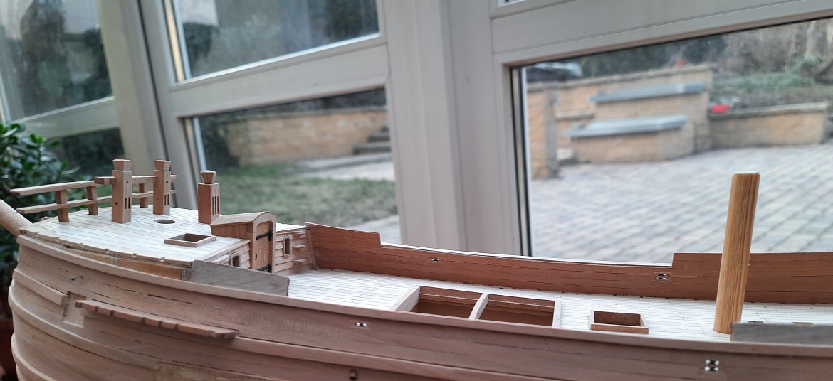 Teraz kiedy burty wystają ponad pokład to rzeczywiście musztarda po obiedzie. A ponadto nie czuję żeby coś w tym miejscu się błyszczało. Podobnie do mnie zrobili godni naśladowania modelarze jak Mati przy swojej papudze czy czeski modelarz Ondras 71 przy Roter Lowe ( relacja na MSW). Drewniane rury pozostaną i dojdą tylko nakładki z gruszy po zewnętrznej stronie burty. Dziękuję ! Janek