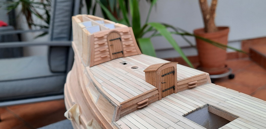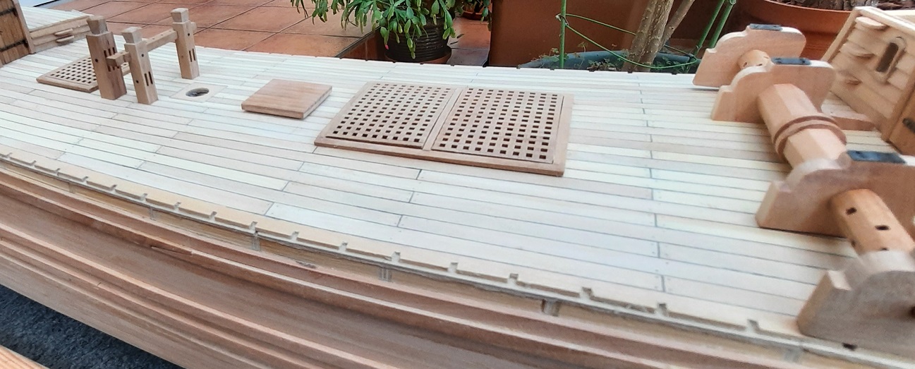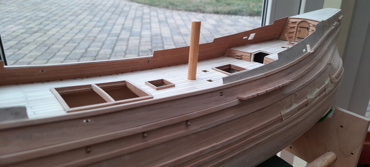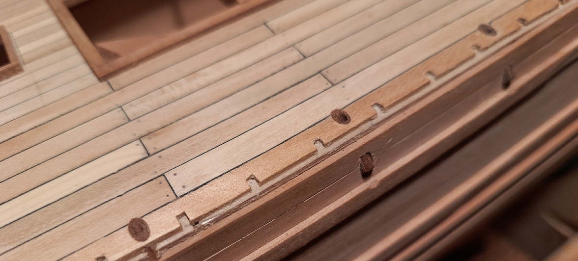 W ostatnim czasie położyłem deski pokładowe na kasztelach, skończyłem poszywanie karawelowe burt, zamocowałem ostatnie odbojnice, a jest ich aż 6 na każdej burcie i rozpocząłem mocowanie wyposażenia na pokładzie. Falszburty składają się z trzech warstw to jest sklejka 0,4 mm, deski 0,5x4 mm z gruszki szwajcarskiej od wewnątrz i deski poszycia zewnętrznego i odbojnice z gruszki. Wyszła z tego bardzo sztywna konstrukcja nawet bez desek zamykających reling od góry. W burtach osadzone są rolki fi 2,5 mm. Do wykonania na burtach pozostało jeszcze poszycie na zakładkę które pierwotnie miało być z zielonkawo-żółtego drewna z perukowca ale uświadomiłem sobie że ja robię czarnego kruka i zdecydowałem że powinny być elementy czarne dla towarzystwa krukowi. Ponieważ nie stosuję żadnych farb deski poszycie klinkierowego są zabejcowane mieszanką hebanu i ciemnego orzecha by przypominały smołowanie. Postęp na załączonych fotkach.