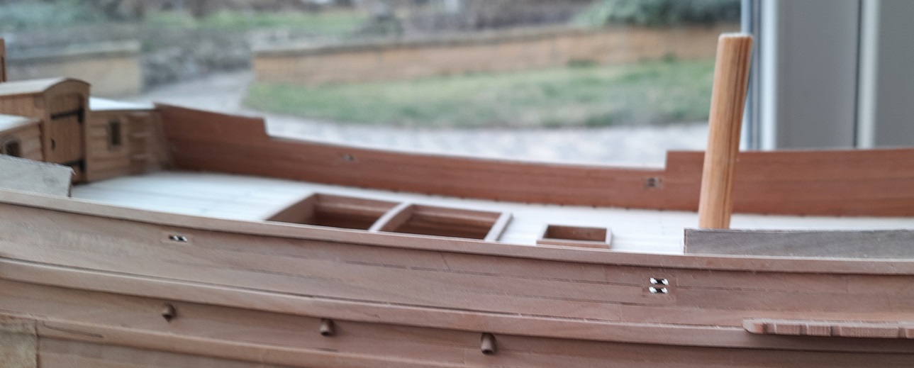 Teraz kiedy burty wystają ponad pokład to rzeczywiście musztarda po obiedzie. A ponadto nie czuję żeby coś w tym miejscu się błyszczało. Podobnie do mnie zrobili godni naśladowania modelarze jak Mati przy swojej papudze czy czeski modelarz Ondras 71 przy Roter Lowe ( relacja na MSW). Drewniane rury pozostaną i dojdą tylko nakładki z gruszy po zewnętrznej stronie burty. Dziękuję ! Janek
