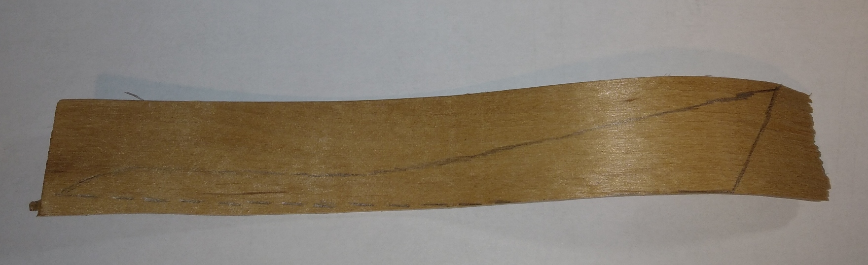 Po pół godzinie wyjąłem go i próbowałem wygiąć go do mniej więcej tego ciasnego łuku - w efekcie pasek złamał się w połowie. Trzeba było więc wyginać oba skrzydełka z osobna. Tu widać naszkicowane skrzydło na jednej z połówek paska.