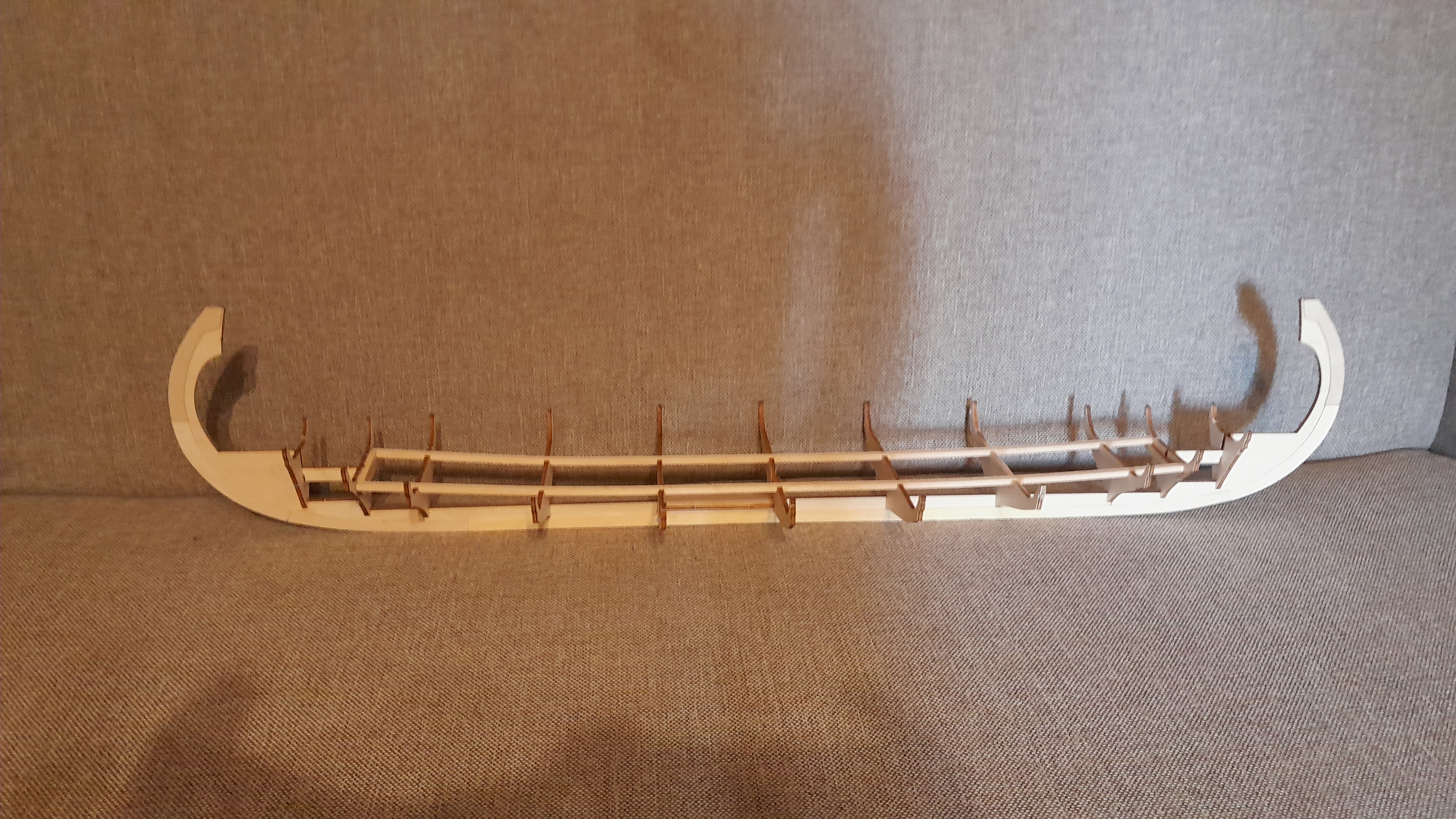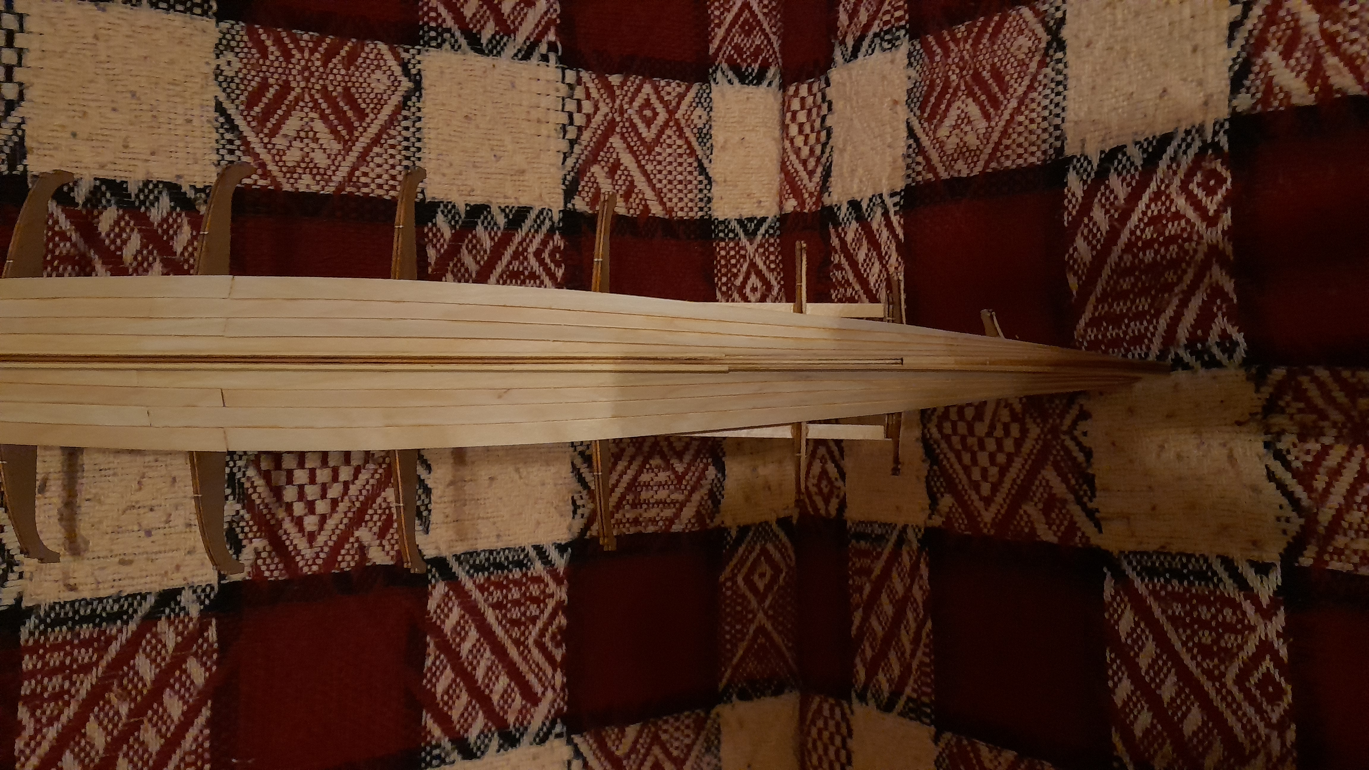 No i fajnie jest... Teraz musisz pamietac, by delikatnie i precyzyjnie zeszlifowac krawedzie wszystkich wreg (grodzi), szczegolnie te na dziobie i rufie tak, by kazda z planek polozona na szkielecie kadluba, przylegala do nich (grodzi) na calej ich grubosci - patrz zalaczona fotka.