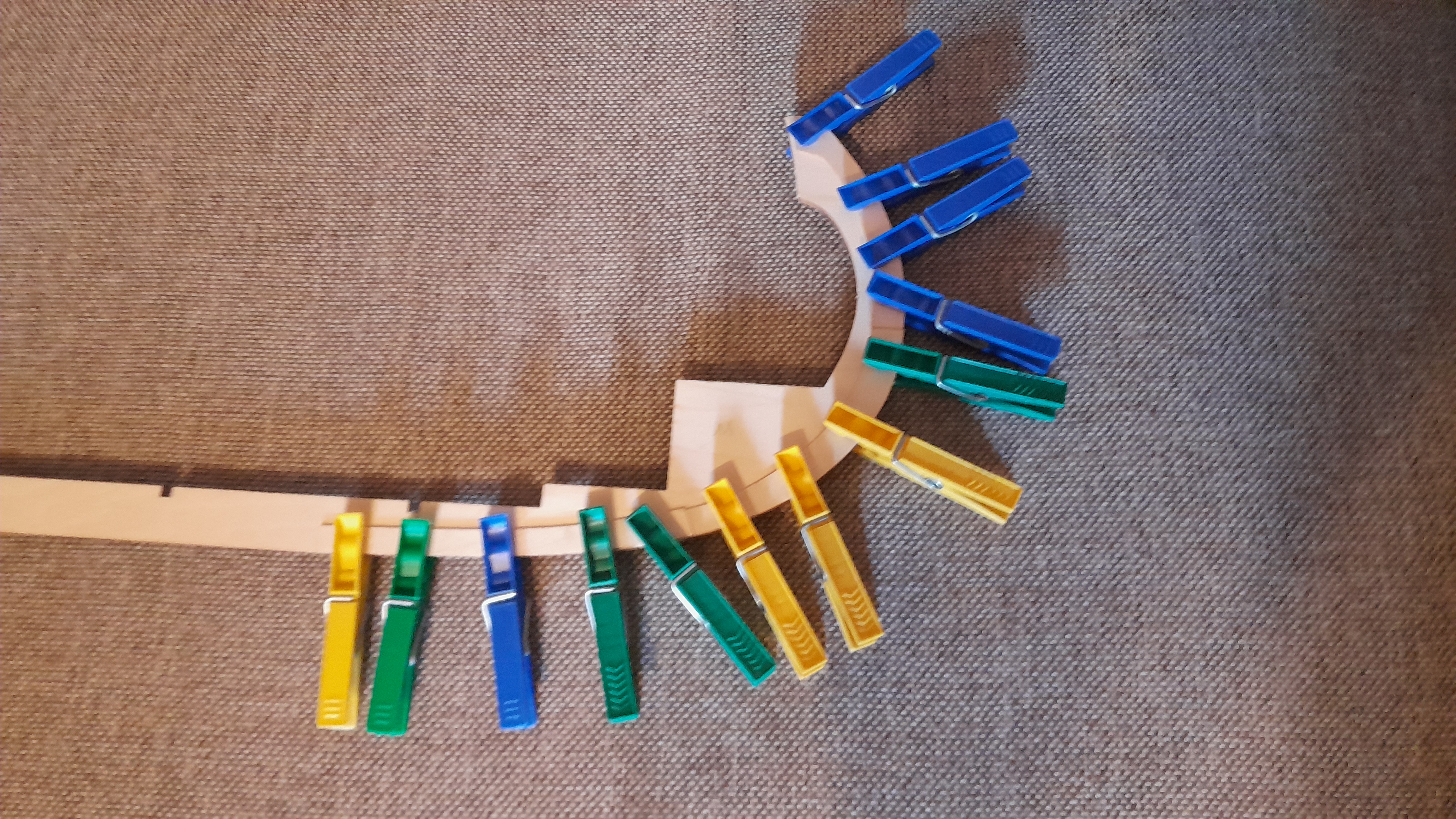 Czyli poniżej stan na chwile obecną. Co do kleju to do elementów konstrukcyjnych użyłem żywicy epoksydowej (wręgi, stępka) a do oklein kleju Soudal 65A. ma on tę zaletę, ze wiąże bardzo szybko ale nie na tyle szybko żeby nie dało się skorygować ułożenia elementów. Nie mniej po 5 minutach spoina jest na tyle trwała ze można elementami swobodnie operować, po zaschnięciu jest całkowicie przezroczysty.
