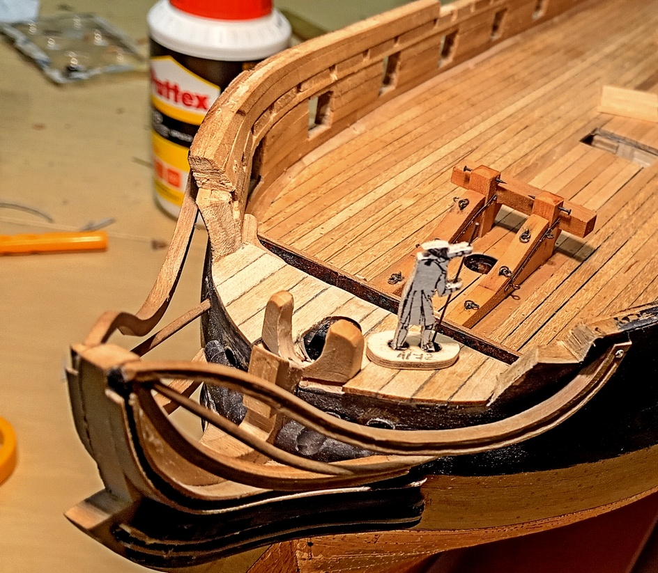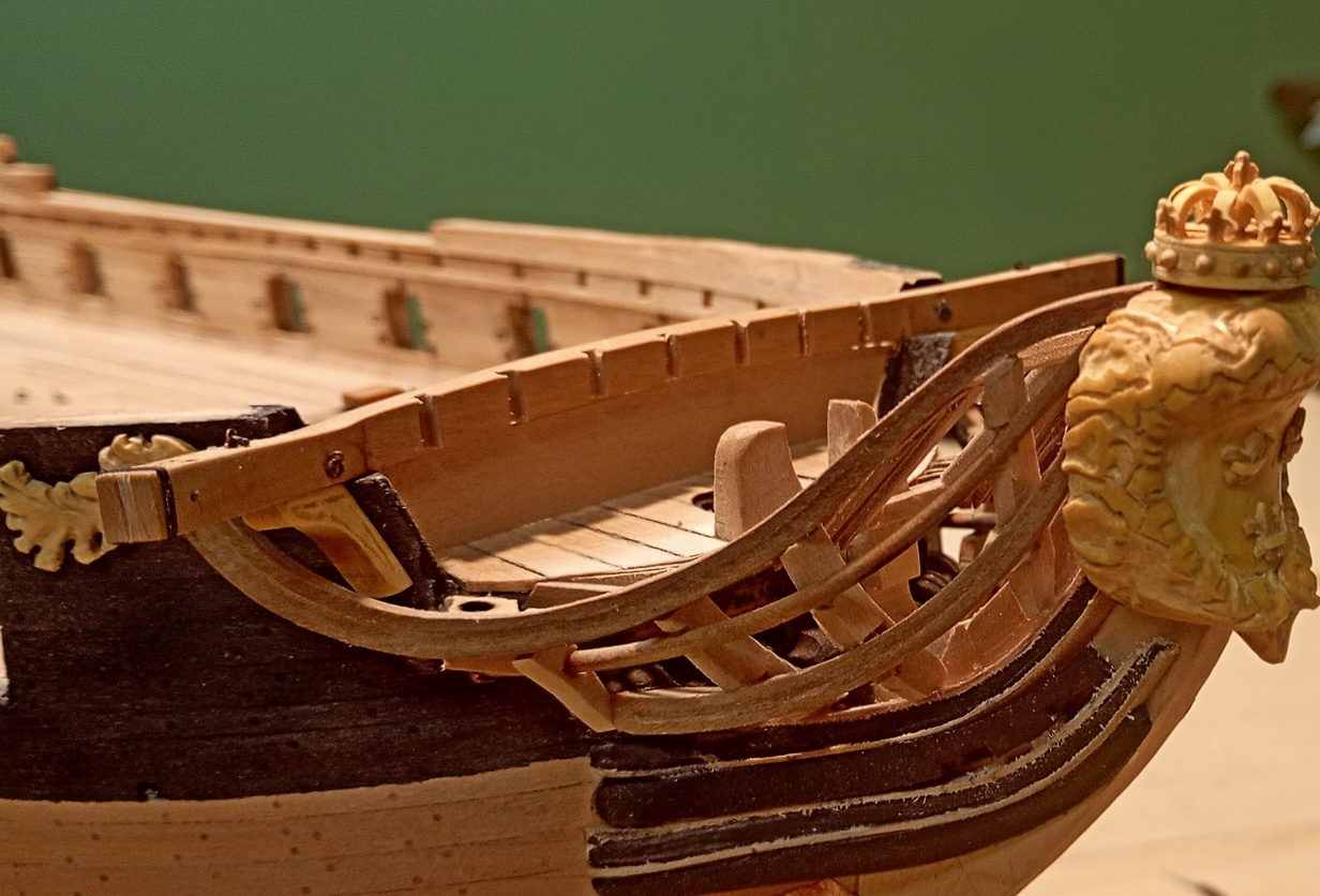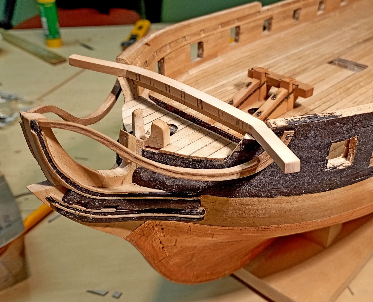 To chyba najtrudniejsza część modelarstwa szkutniczego. W tym przypadku, kluczowe znaczenie ma właściwe zaplanowanie kolejności prac. Dlatego musiałem już teraz wykonać pachoł kotwiczny i kotbelki, aby móc odpowiednio ukształtować przednią część nadburci.To tak naprawdę dopiero początek budowy kosza dziobowego, dalej będzie tylko trudniej.