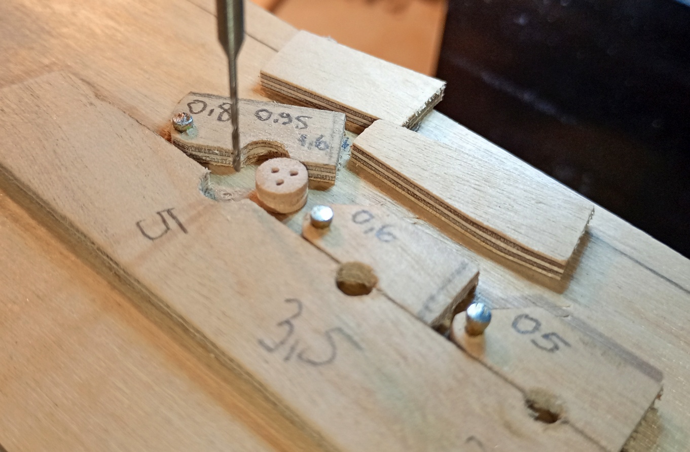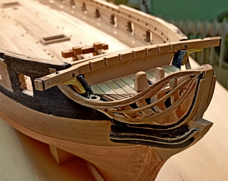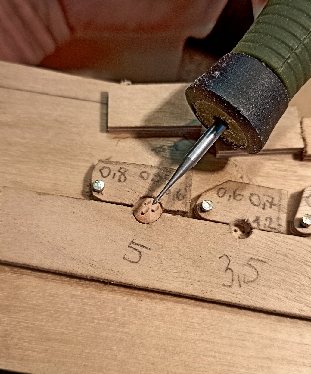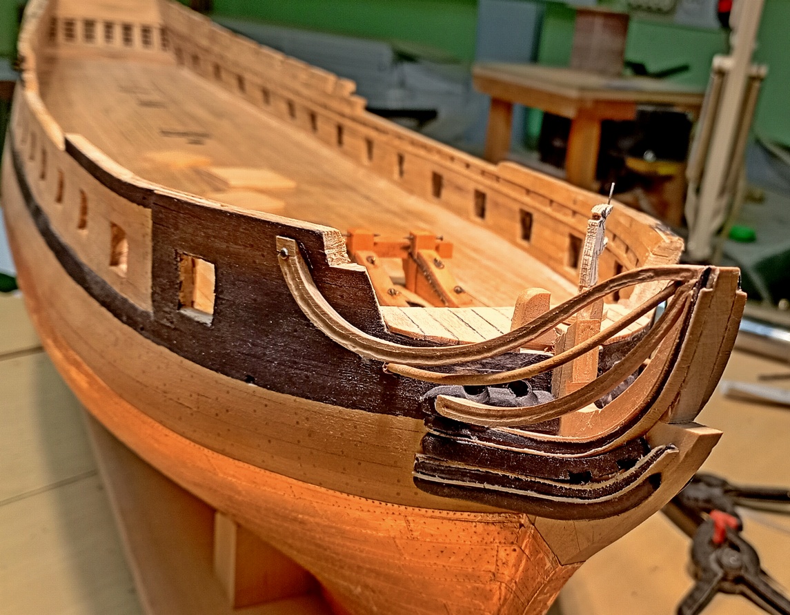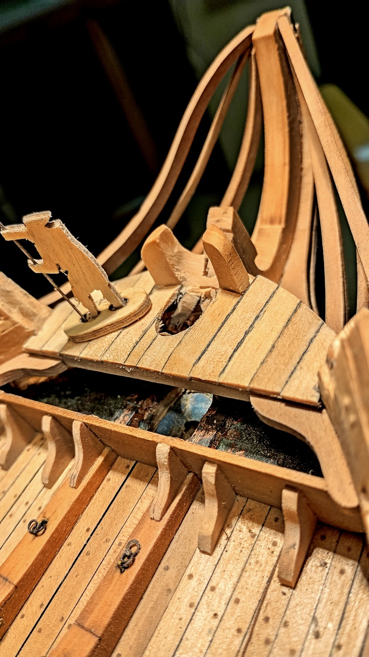 To chyba najtrudniejsza część modelarstwa szkutniczego. W tym przypadku, kluczowe znaczenie ma właściwe zaplanowanie kolejności prac. Dlatego musiałem już teraz wykonać pachoł kotwiczny i kotbelki, aby móc odpowiednio ukształtować przednią część nadburci.
