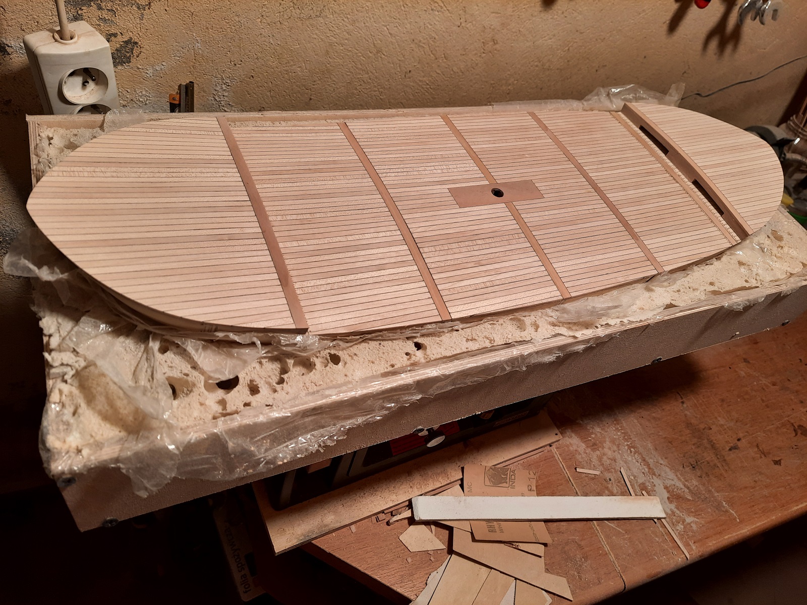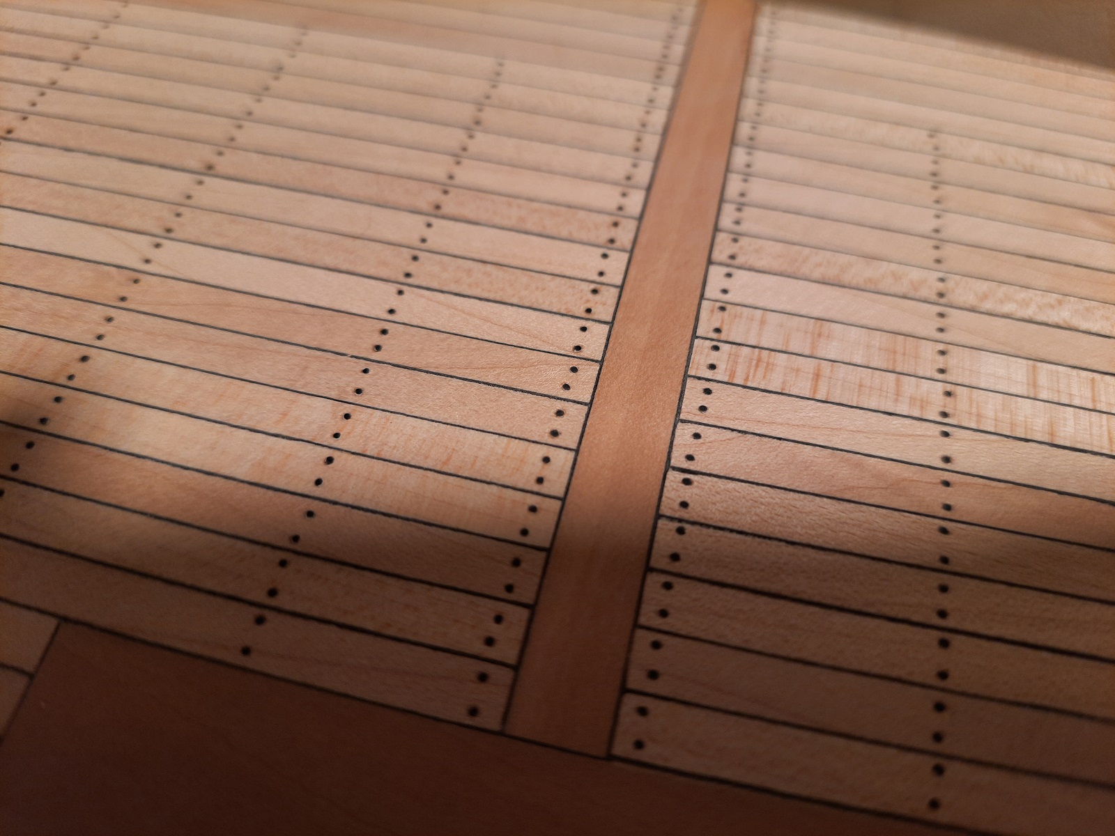 Wszystkim Kogowiczom na nowy rok życzę zdrowia, wszelkiej pomyślności i udanych prac modelarskich. Tym którzy coś składają a nie prezentują na naszym forum życzę odwagi aby podjęli tą próbę. Ja na zamknięcie roku zamknąłem pokład w budowanym nefie. Pomysł gwoździ na pokładzie zaczerpnąłem od Atamana. Włosie szczotki daje radę choć jest dość upierdliwe bo każde trzeba wkleić w nawiercony otwór. Jak wyszło zobaczcie na załączonych zdjęciach