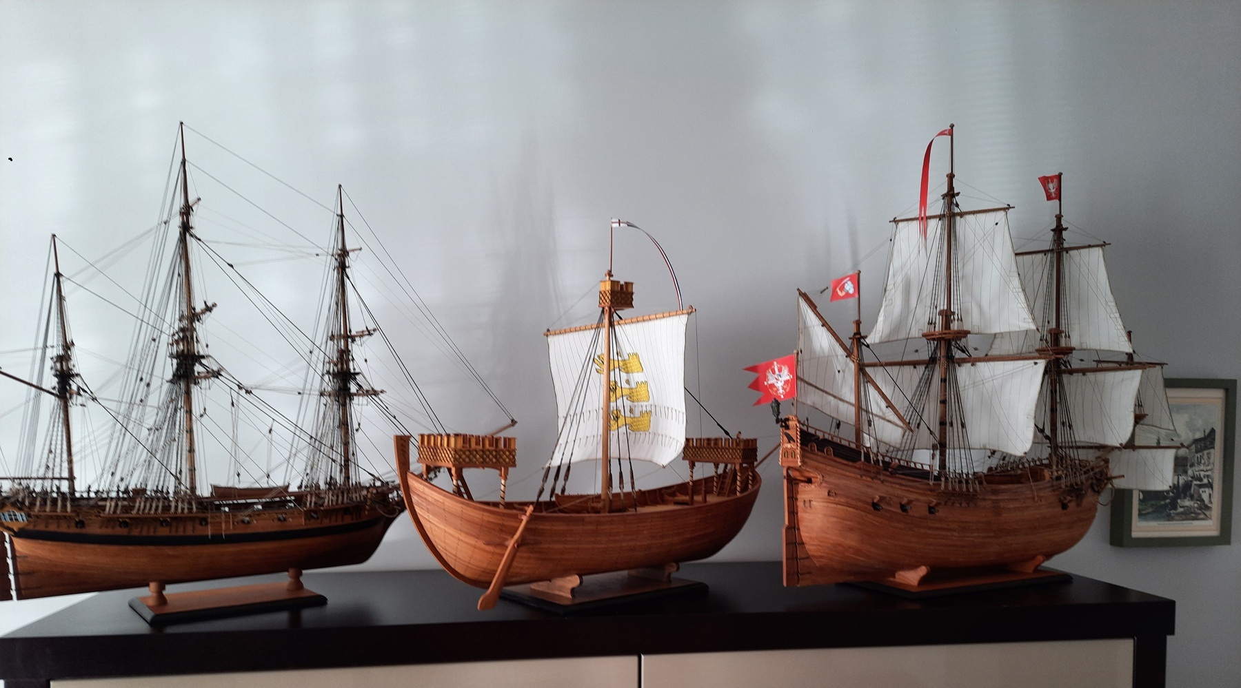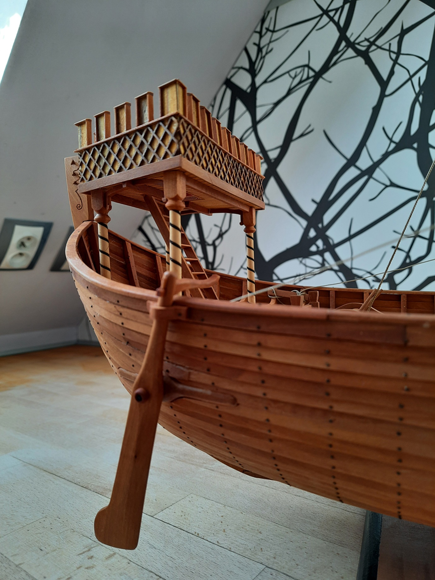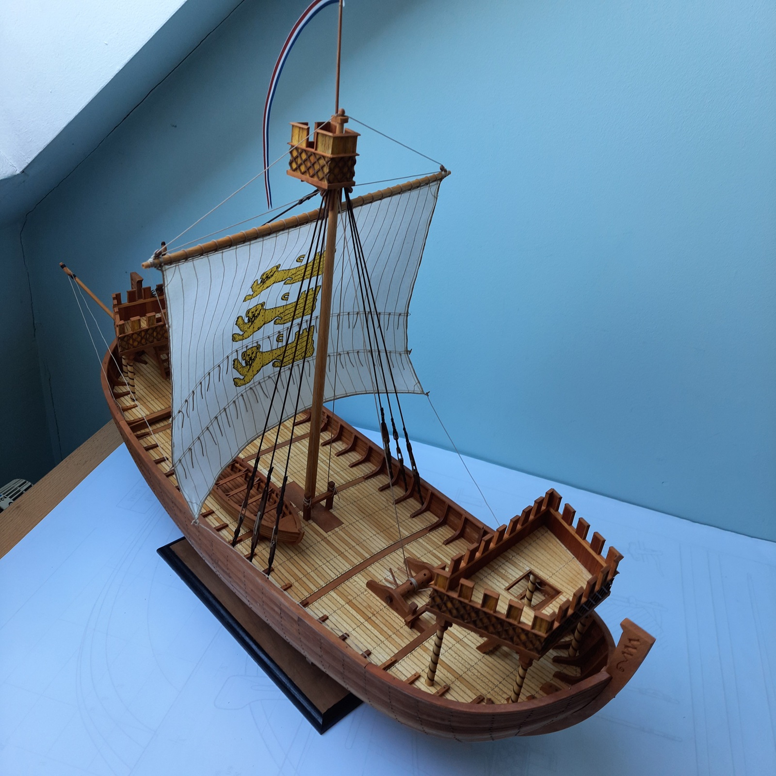 Nef dostał ster wiosłowy tylko na prawej burcie, kołowrót i pachoły do mocowania lin. Kasztele i maszt z bocianim gniazdem są połażone na "sucho" . Brak mi wiedzy co działo się pod pokładem czy były jakieś ładownie czy też pomieszczenia na inne funkcje. Moje wyliczenia biorące pod uwagę jedynie skalę wskazują że między stępką a pokładnikami na śródokręciu było 2,35 m wysokości a więc nawet gdyby wsypali tam 0,5 m balastu to pozostaje jeszcze 1,75 m przestrzeni do zagospodarowania. Jak na razie jestem za wykonaniem jakiejś pokrywy ładowni. U wikingów nawet przy budowie repliki w temacie użyteczności przestrzeni pod pokładem panuje cisza. Dla ilustracji postępu pare fotek.