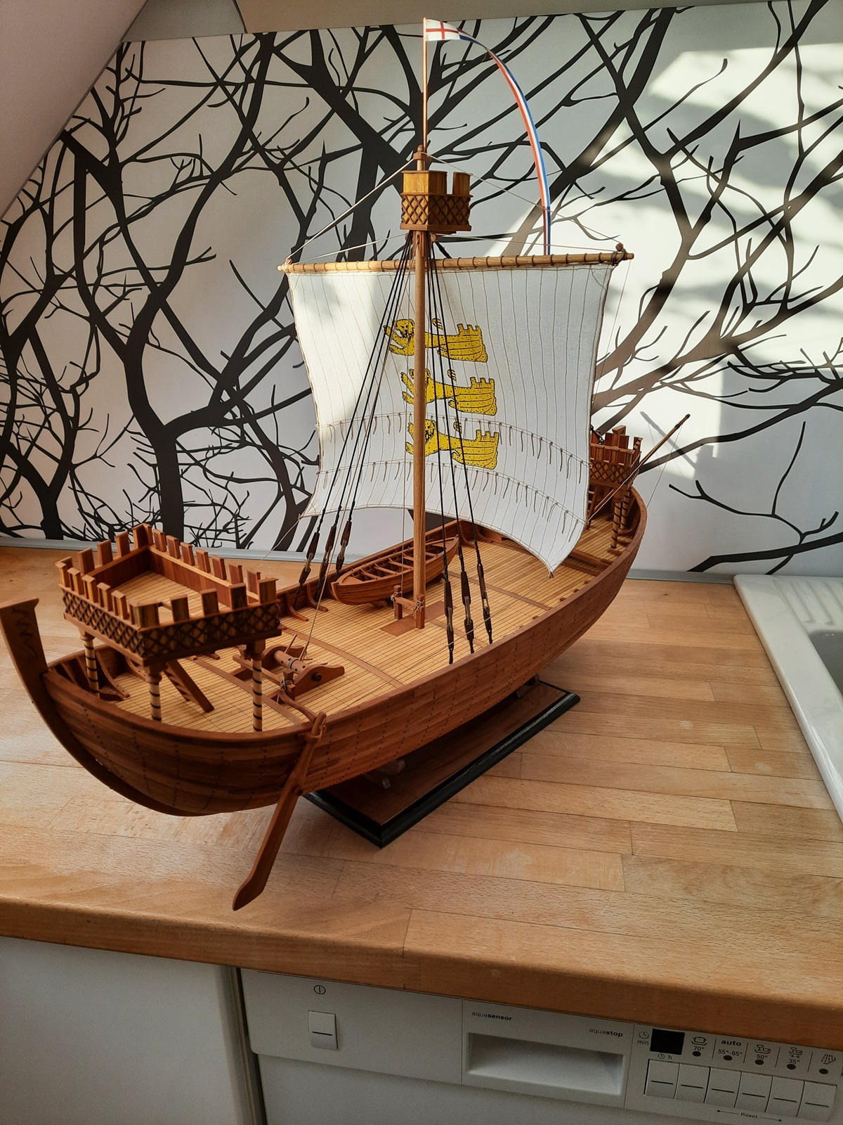 Wiosna to nie najlepszy czas na modelowanie, ale w chłodne i mokre dni udało się coś zrobić. Model dostał szalupę na 5 par wioseł. Pierwsze szalupy układano na pokładzie do góry dnem, dopiero potem ustawiano je stępką do dołu. Bardziej efektowna wydaje mi się ten późniejszy sposób ale to oceńcie sami.