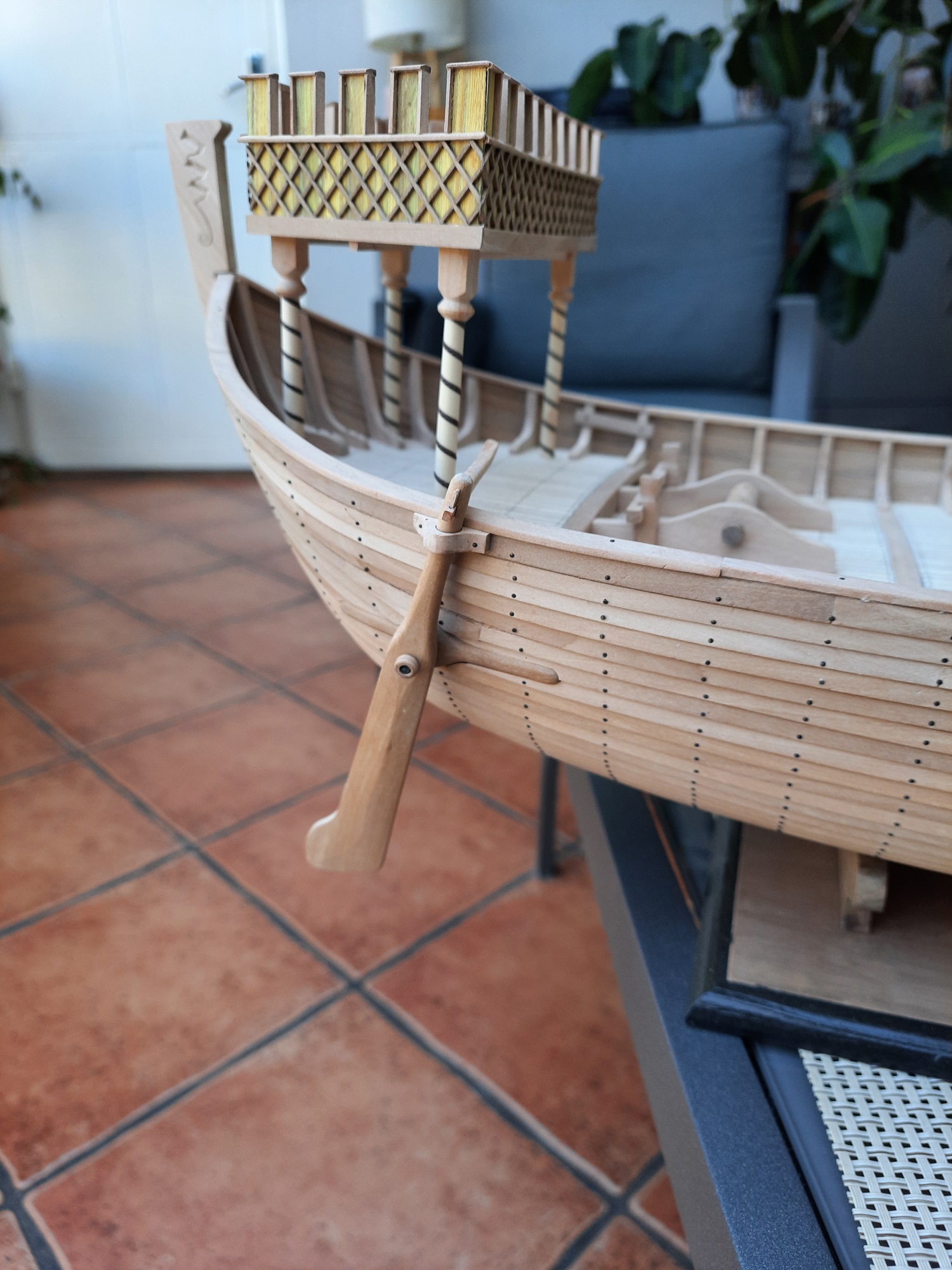 Wiosna to nie najlepszy czas na modelowanie, ale w chłodne i mokre dni udało się coś zrobić. Model dostał szalupę na 5 par wioseł. Pierwsze szalupy układano na pokładzie do góry dnem, dopiero potem ustawiano je stępką do dołu. Bardziej efektowna wydaje mi się ten późniejszy sposób ale to oceńcie sami.