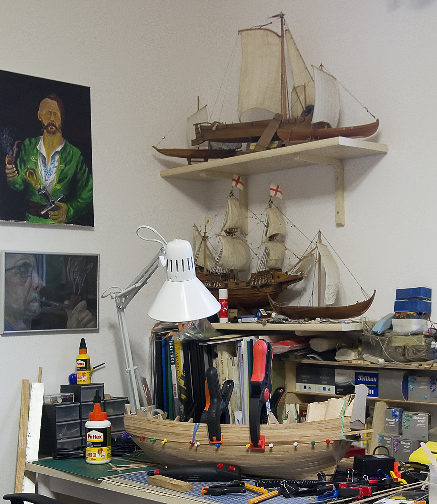 No dobra, przyznam się. Od jakiegoś czasu, być może od roku też coś kleję. Znaczy, jak mam czas i jeszcze jak mnie wena tfórcza najdzie, to coś tam podłubię. Po Osebergu zerkałem na rożne łajby i zastanawiałem się coby tu poważniejszego, ale jednocześnie nie za skomplikowanego spróbować zbudować. No i wybór padł na taką sobie XVII wieczną fregatę. Ja tam jakiś zaawansowany modelarz nie jestem, technikiem ani inżynierem też nie, ino taki sobie humanista, więc chciałem model który jako tako uda mi się skleić po poprzednich doświadczeniach, ale też taki który będzie miał conieco, ale nie za dużo jakichś wymagających gimnastyki elementów. Model ten to nie jakiś Victory czy inny Royal jakiś tam, ale mimo wszystko trochę skomplikowanych motywów jest, czyli to o co mi chodziło. Zacząłem się rozglądać za planami, udało mi się wypatrzeć na fajfoklockim Ebayu orginalne plany Corela, zakupiłem i zabrałem się za robotę. Na początek był szkielet, potem poszycie pierwsze, na to poszycie drugie … i tak zeszło może z pół roku budowy..