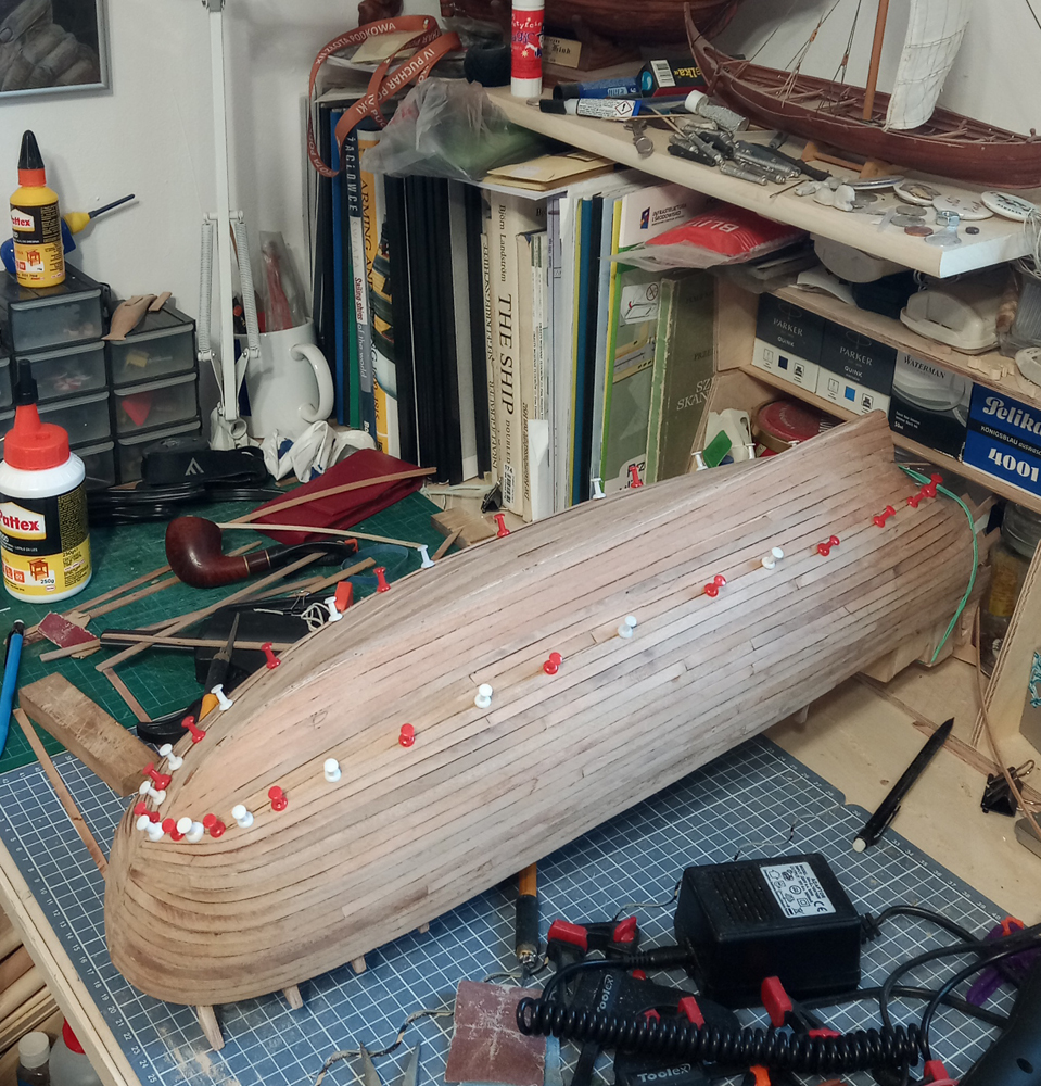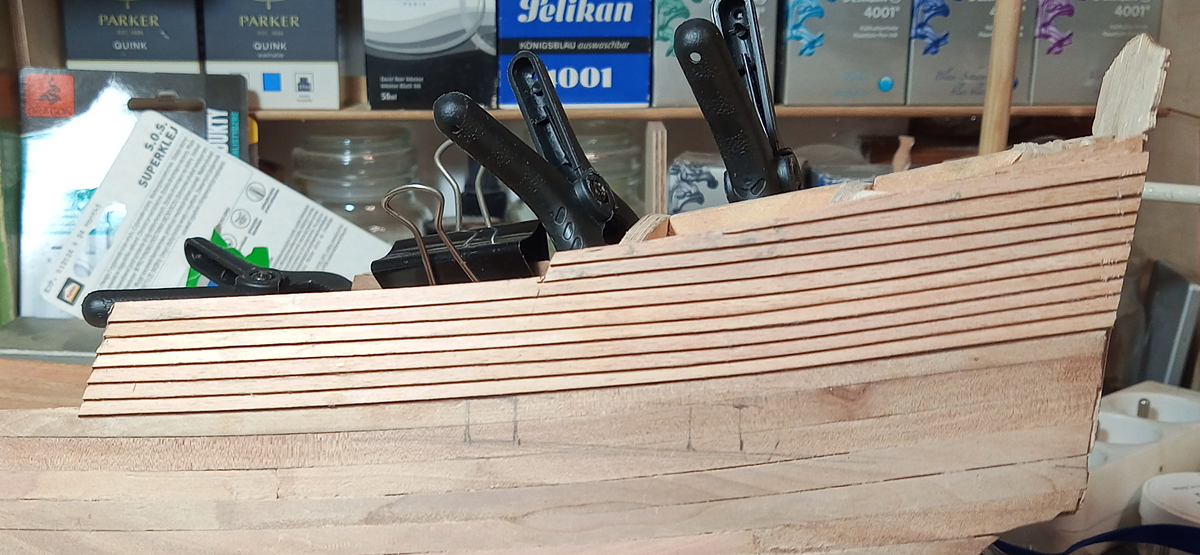 Po przyklejeniu do burty listewki układały się w zadowalający sposób…