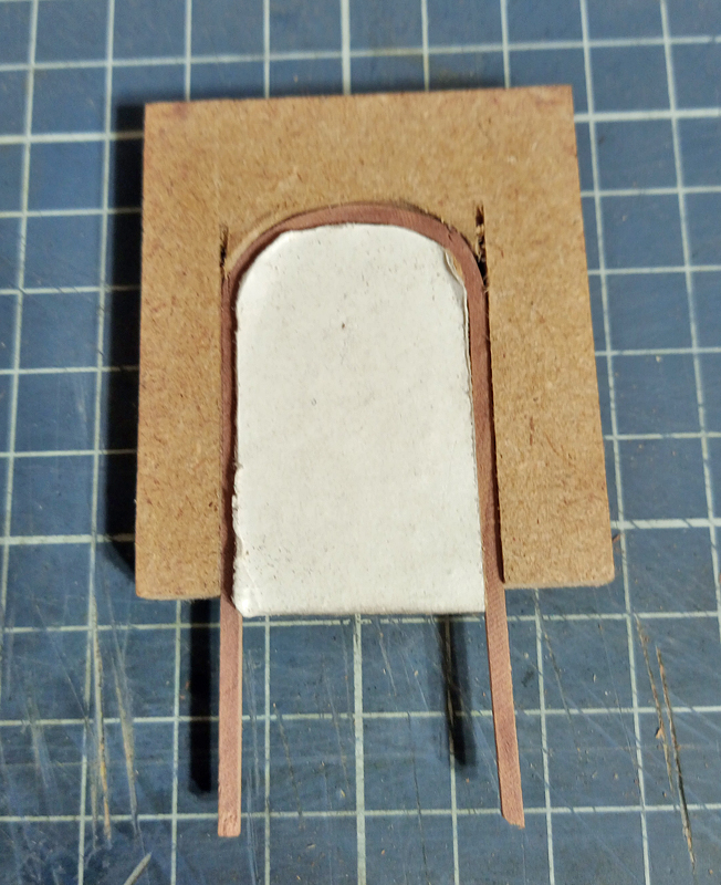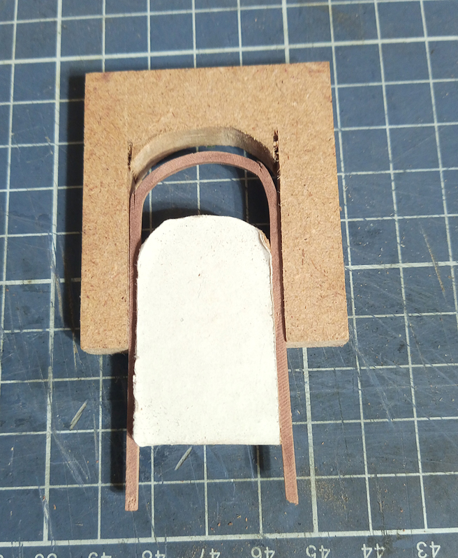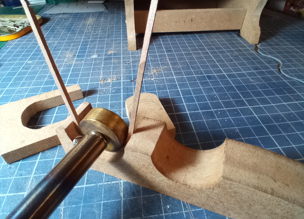 Trzeba było zrobić wrota do tej stodoły. Trochę musiałem pogłówkować i pokombinować jak zrobić futryny, jako, że one zaokrąglone. Gięcie na mokro i na gorąco nie dawało pożądanego efektu. Więc wymyśliłem sobie taką pomoc naukową.