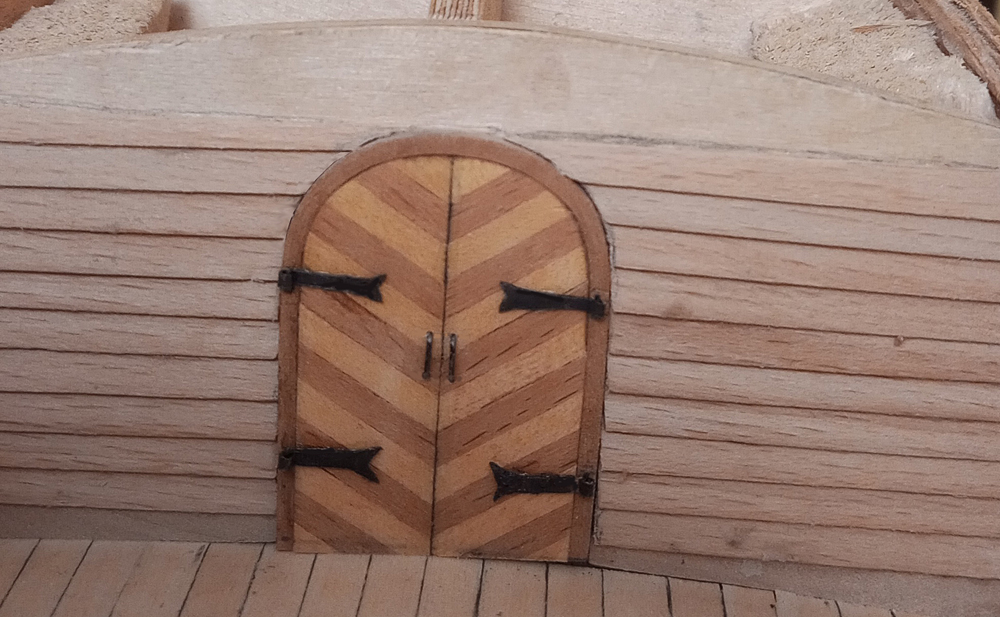 ale coś mi tu nie pasowało. Znów zabrałem się za przeglądanie fotek z modelami z takim poszyciem kasztelu i Eureka… Za wysoko zacząłem przyklejać poszycie na zakładkę, powinno się zaczynać na wysokości końca burty na śródokręciu, a ja zacząłem jeden „ząbek” wyżej. No to trza było znów zrywać i po raz trzeci oklejać kasztel. Tym razem skutecznie.