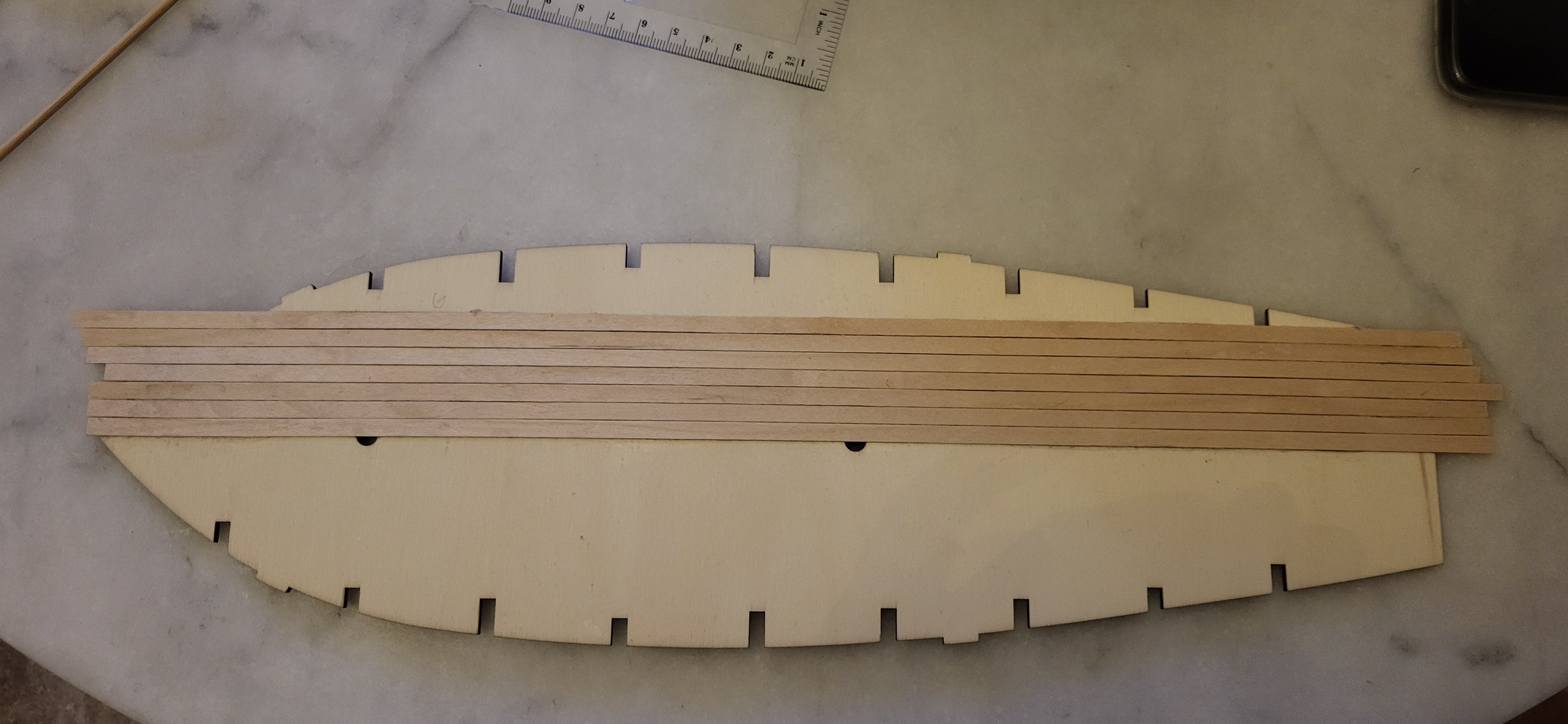 Rzeczywiście zasugerowałem się instrukcją i filmikami, ale chyba lepiej byłoby pociąć na odcinki np 6 cm i układać jak panele. W załączniku wstawiłem ich propozycję z rysowaniem linii i atrapy gwozdzi na której się wzorowałem, ale twój pomysł mógłby być efektowniejszy. Nie wiem czy na statkach są gwożdzie na pokładzie tak wbite?, jakoś mi to nie pasuje. W skrócie to ich pomysł był na malowanie linii i gwozdzi ołówkiem, a pożniej ich utrwalanie chyba lakierem, muszę to przetłumaczyć w translatorze. Mam już połowę, szkoda zrywać, jeszcze nad tym pomyślę.