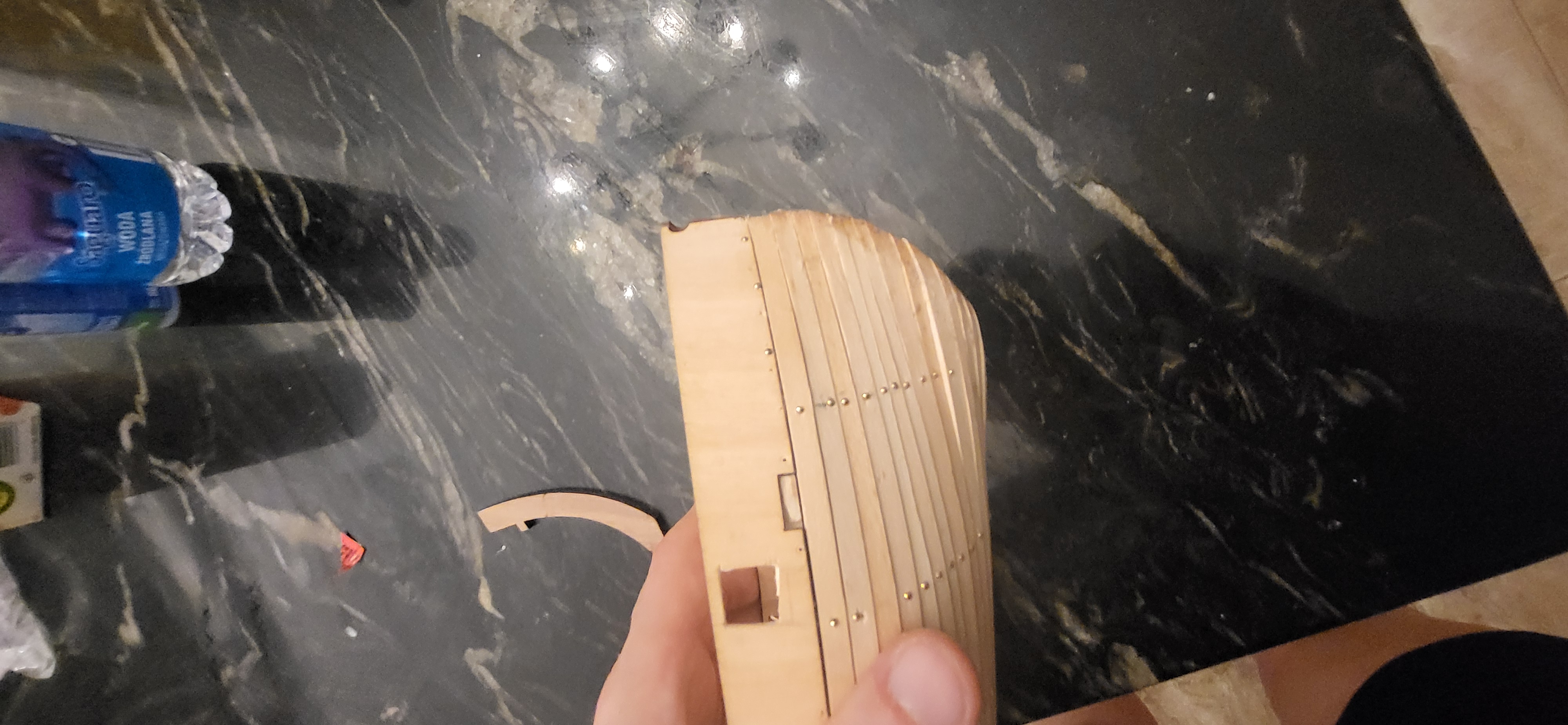 Przeglądam właśnie filmiki innych leszczy, takich jak ja na YT co Polarisa poszycie robili ale w przeciwieństwie do mnie zgodnie z instrukcją np.: i powiem tak, nie wiem czy robienie w tym modelu poszycia zgodnie z instrukcją to dobry pomysł, te docinane strzępki się wyginają, nie schodzą i na filmiku widać że zabawy z docinaniem jest też sporo, a deseczki to w trójkąty tną np 5:50 sek :shock: Mnie brakło wyobrazni i dziub lekko garbaty, ale reszta ok, dalej się wyszlifuje, może drugie poszycie lepiej wyjdzie :roll: tymczasem gwózdki wyjęte wszystkie 8-) miłego dnia Przy szlifowaniu chyba dodam masy szpachlowej do drewna to te dziurki pokryje 8-)