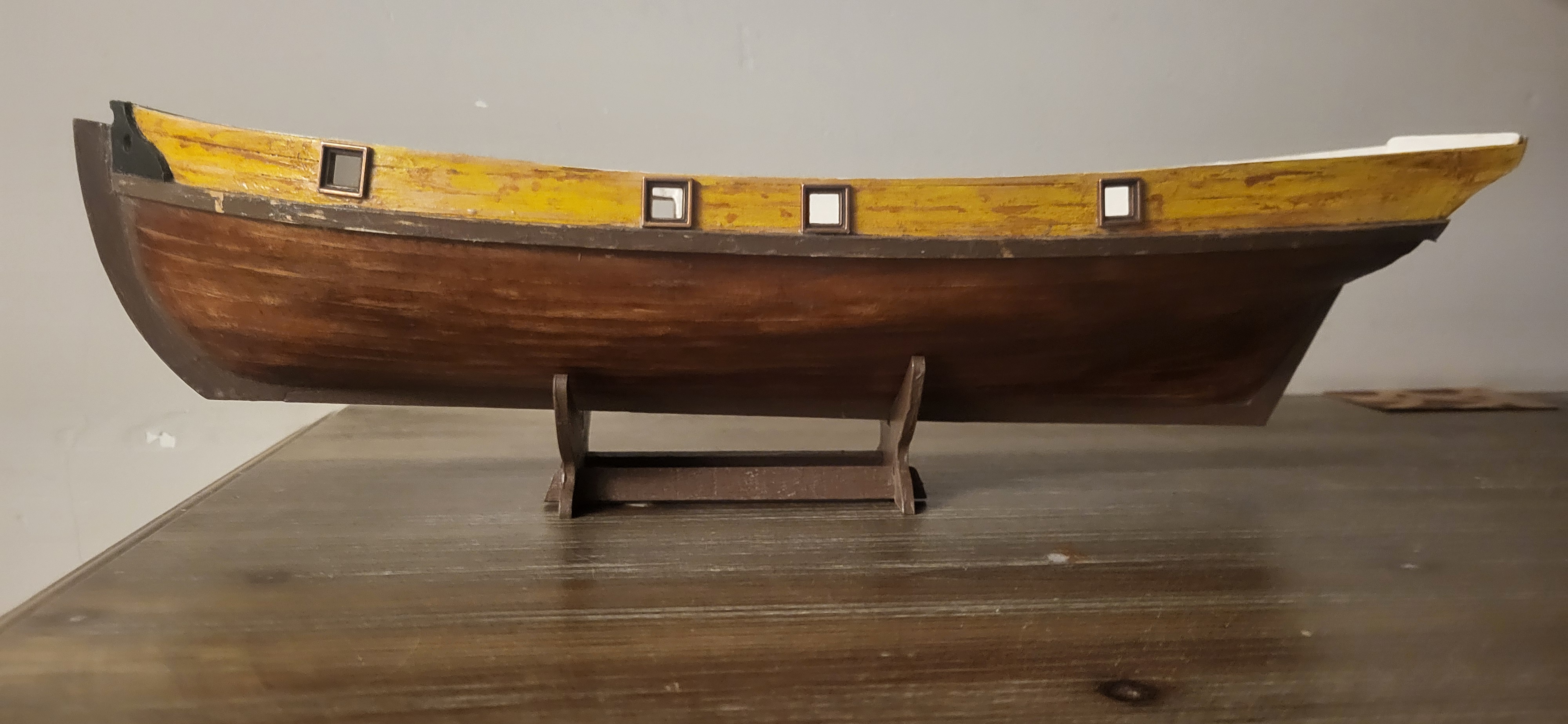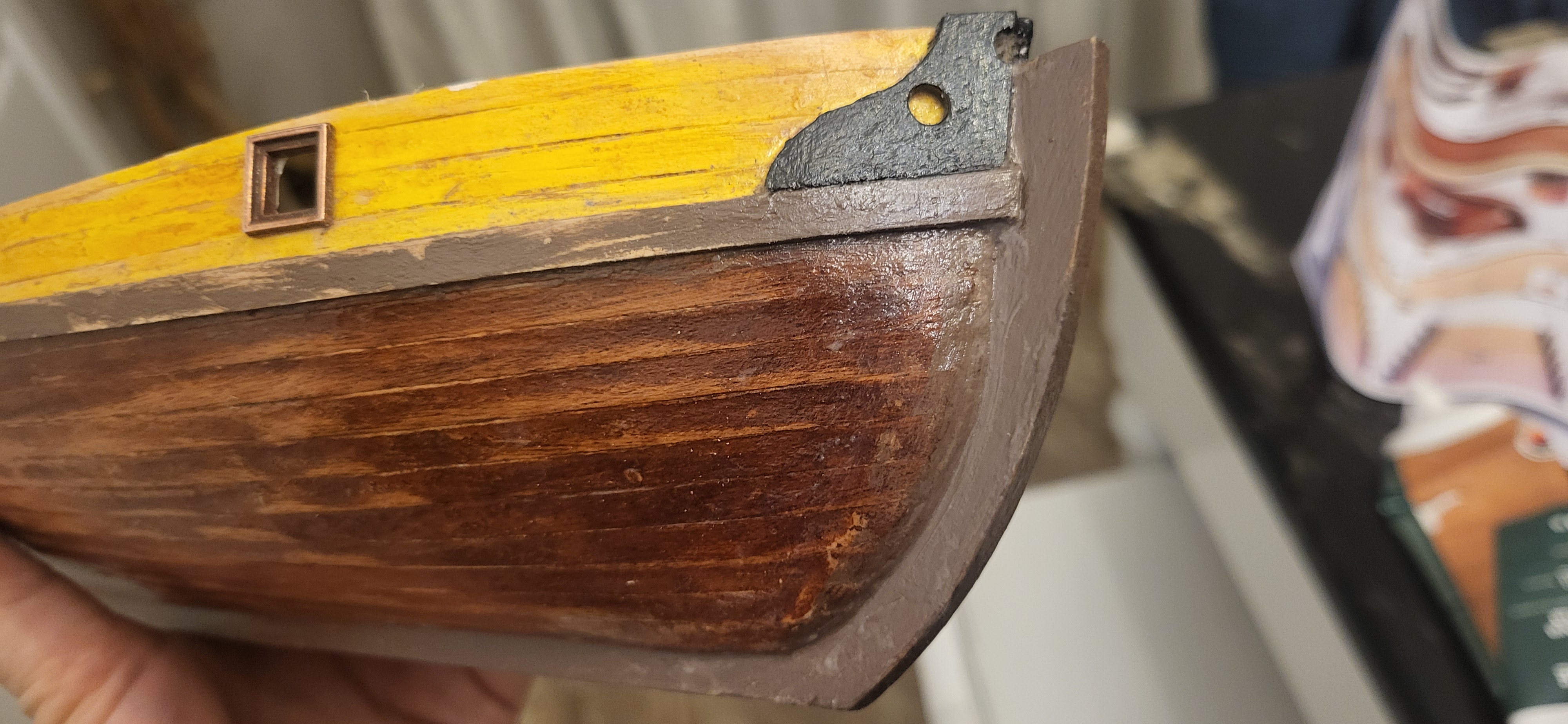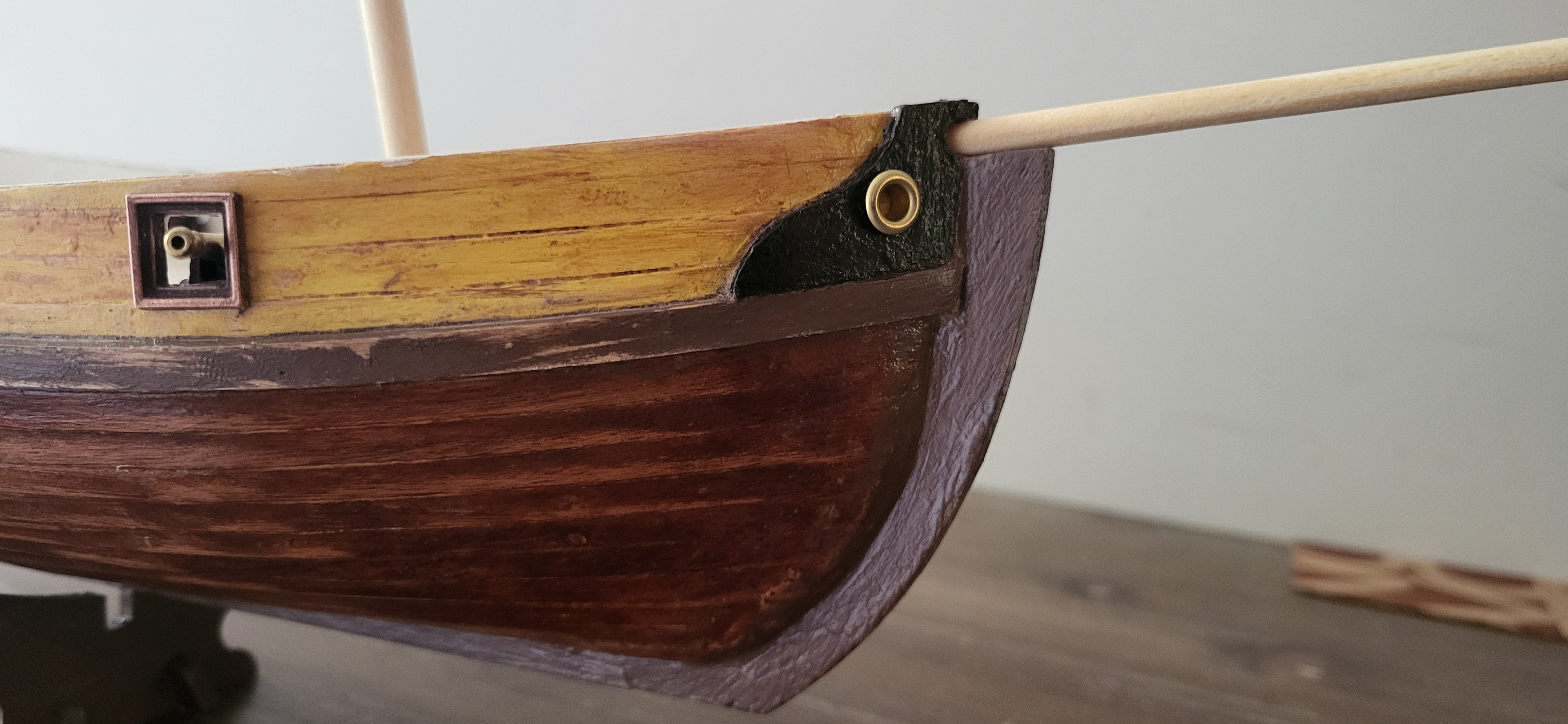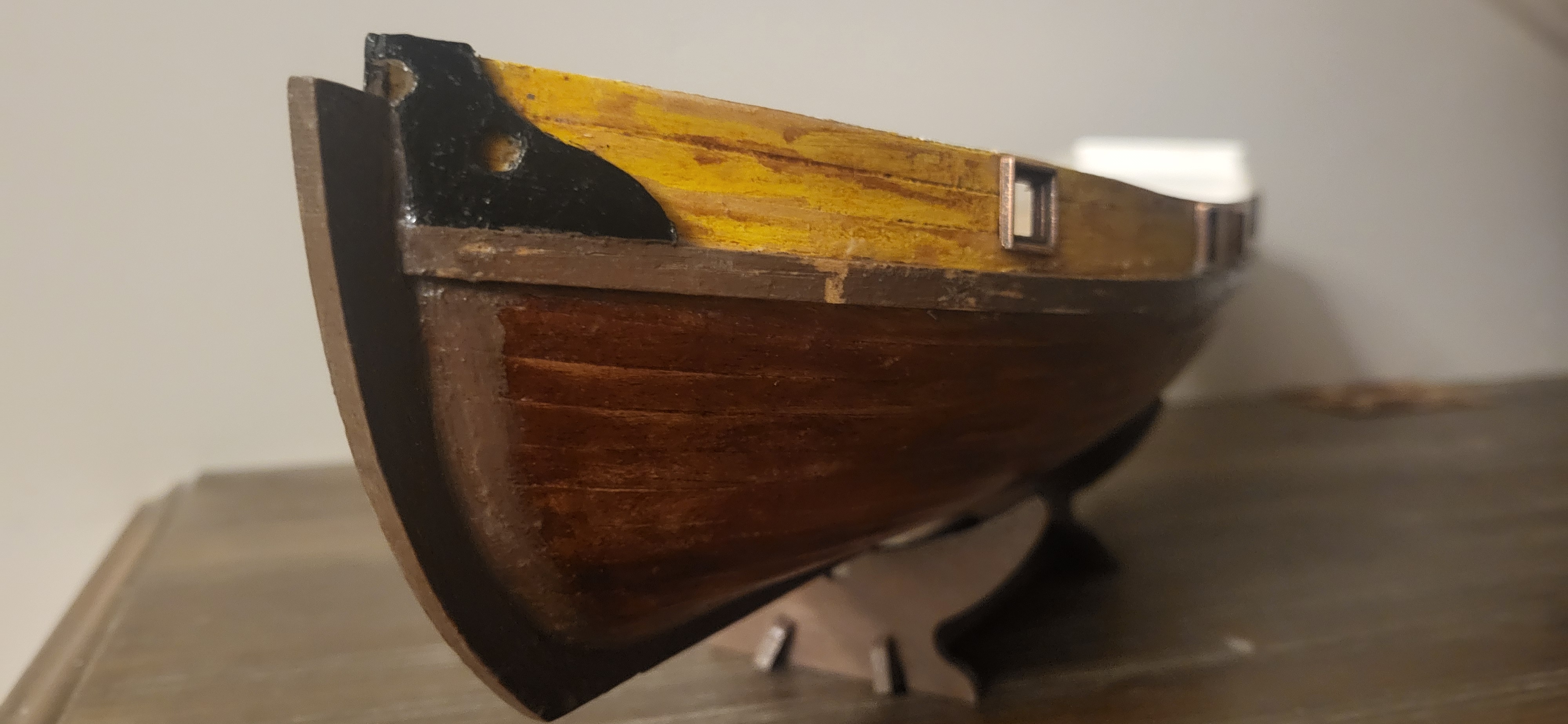 Możliwe, że udało się poprawić deskowanie dziobu bo ciągle bejca nie równo brała, dałem farbę jak na powyższych fotkach, ten gruby pas farby. Teraz podszlifiwałem kilka razy i dałem satynową, zobaczymy jak wyschnie, to jest wojna :lol: