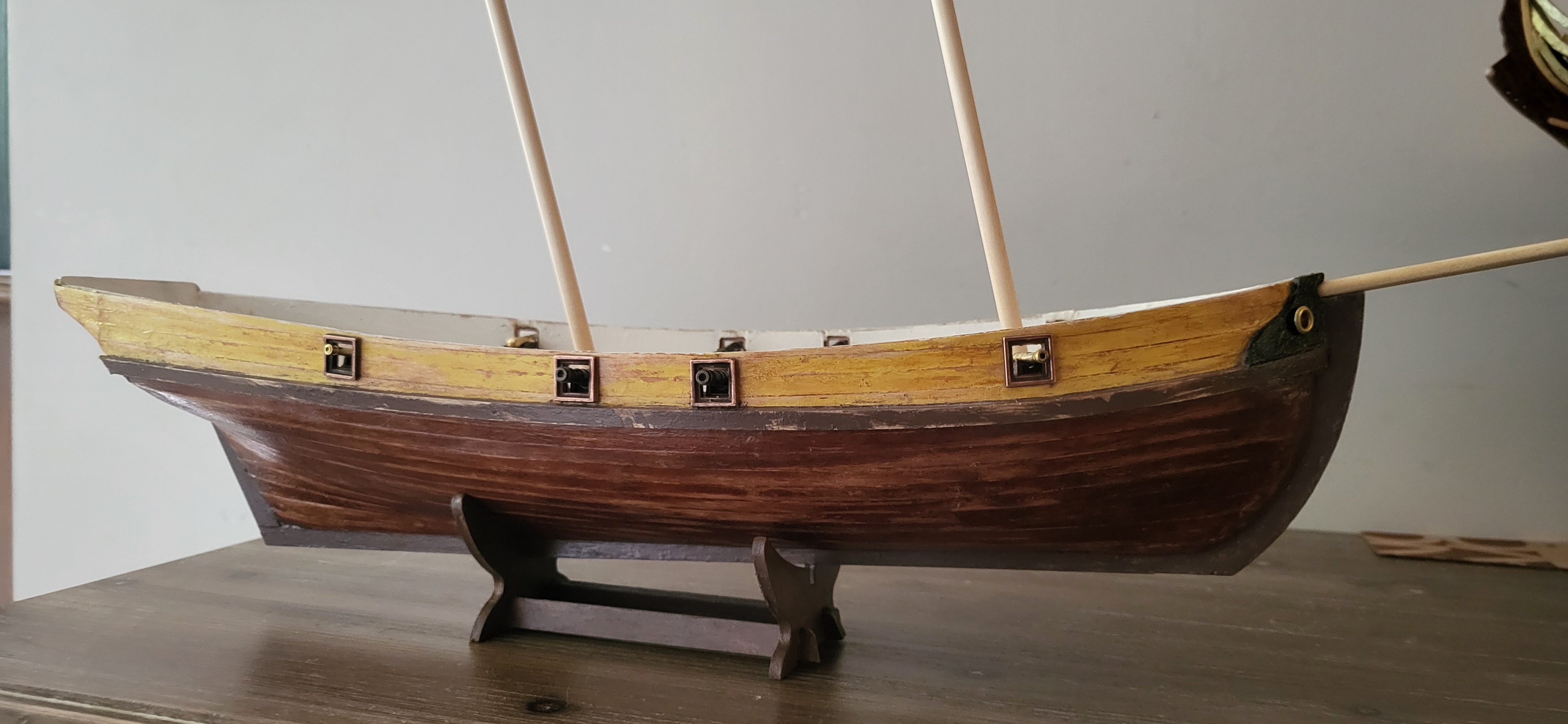Łatanie otworów pod działa -od środka ciąg dalszy, potem szlifowanie i farba no i poprawki, przypominam, że niestety burty były uszkodzone i naprawiane, gdy zrywałem i ponownie kładłem pokład. Teraz trzeba kombinować, no i kamuflować otwory od środka bo tego nie było w instrukcji. Maszty luxzno włożone - poglądowo, dobrej nocy