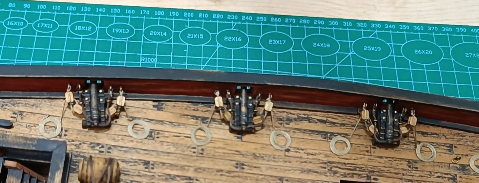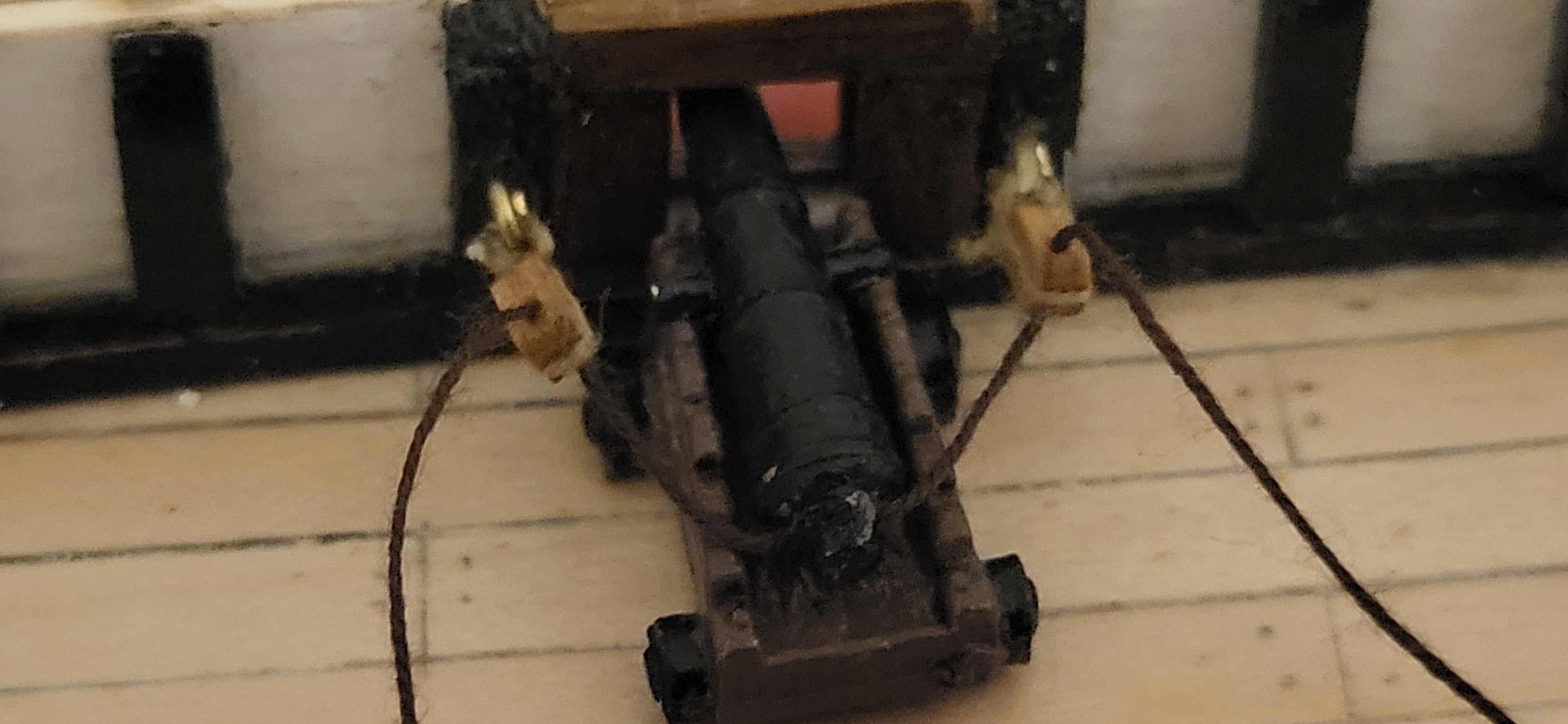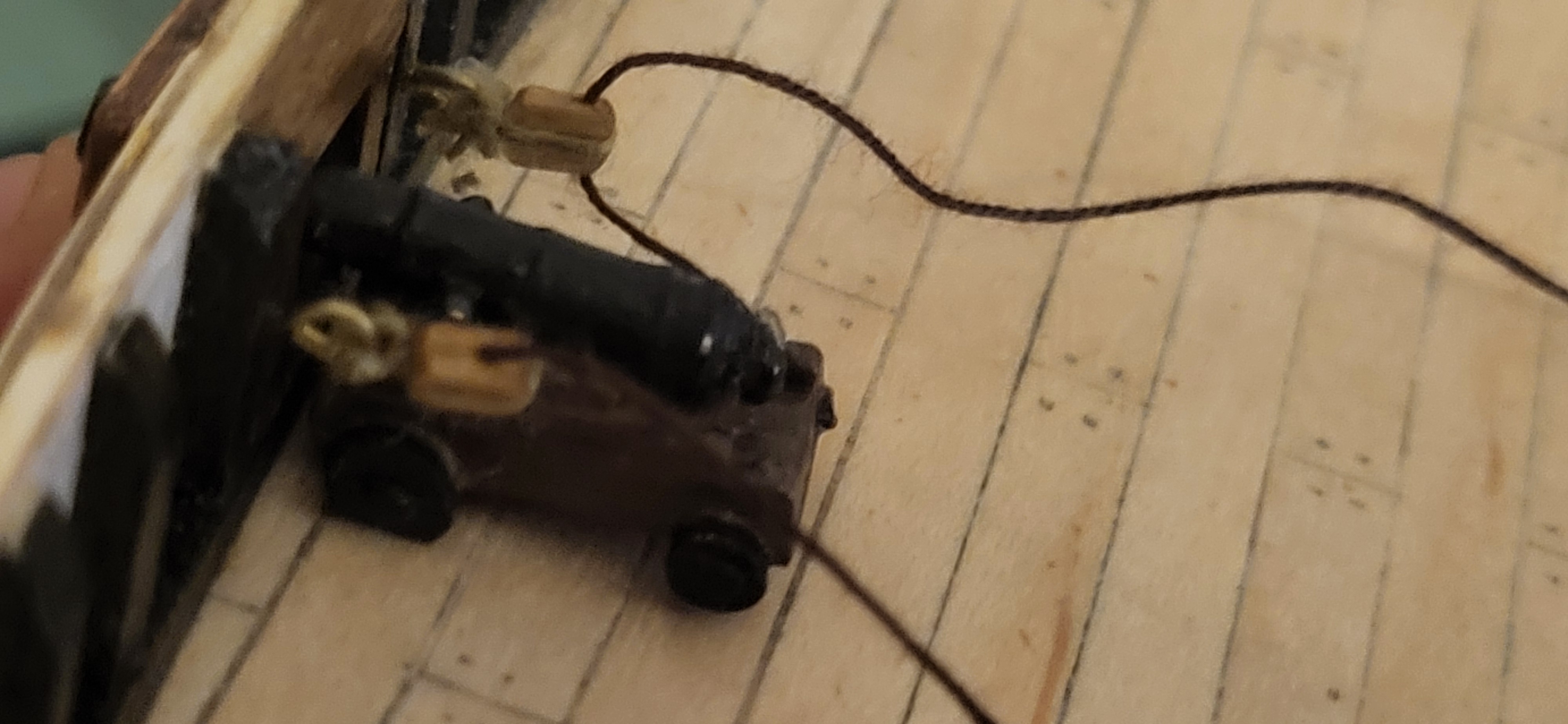 Dłubaniny ciąg dalszy, dalej na pokładzie, kolejne drobne elementy dorobione, jeszcze sporo pracy. Chatka puchatka ustawiona w celach poglądowych, szacuje przestrzeń potrzebną do wiązania armat do burt, szczególnie obok chatki i w srodku obok siebie są blisko armaty, jak w załączniku pierwsze foto, czy mi wystarczy miejsca, czy bede musiał zrobić wersje uproszczone wiązania, napewno zastosuje mniejsze bloczki, zobaczymy, Dobrej nocy