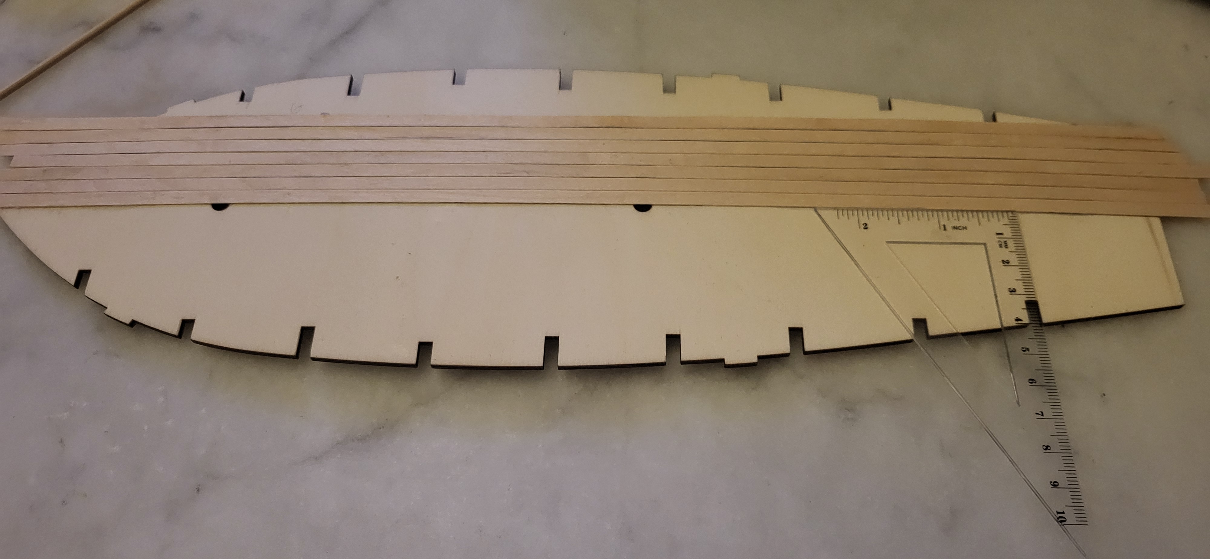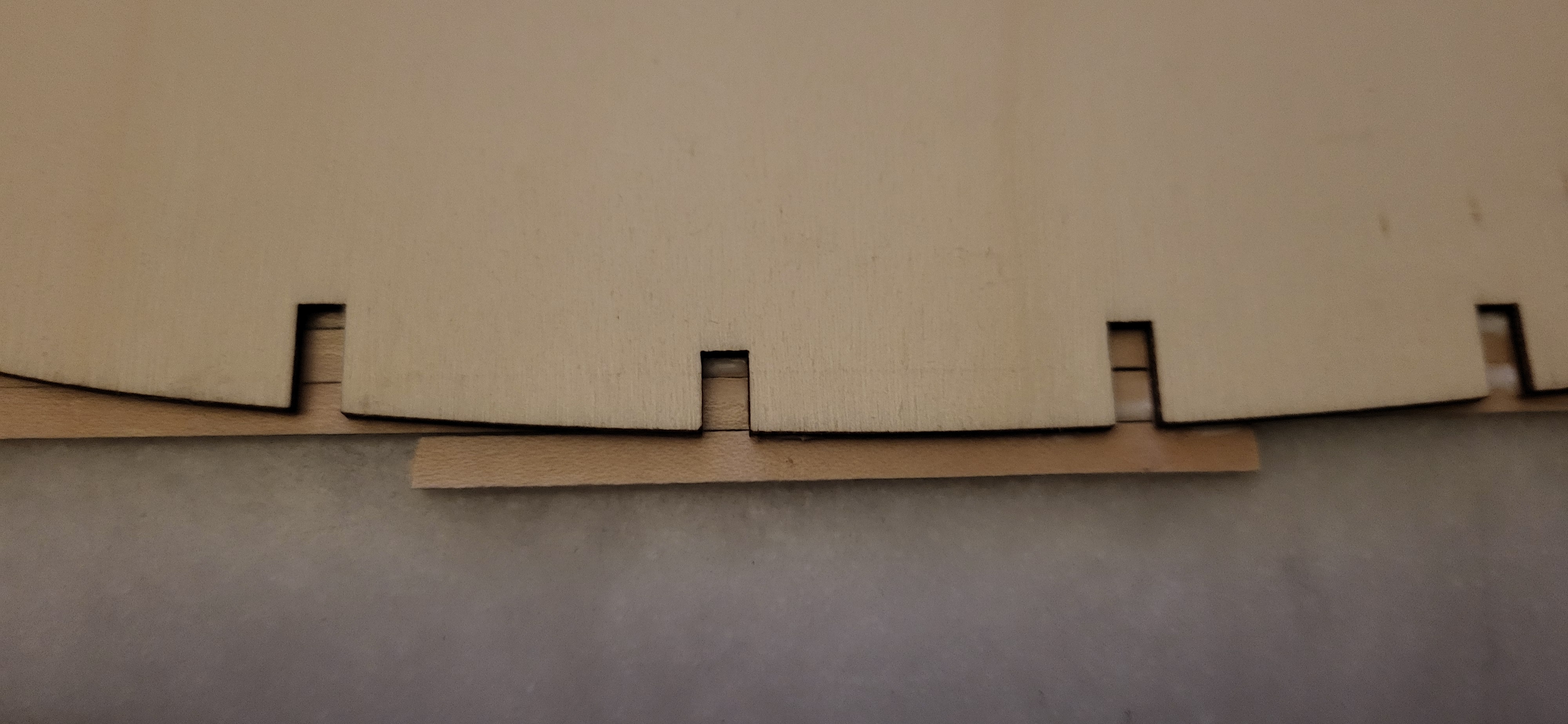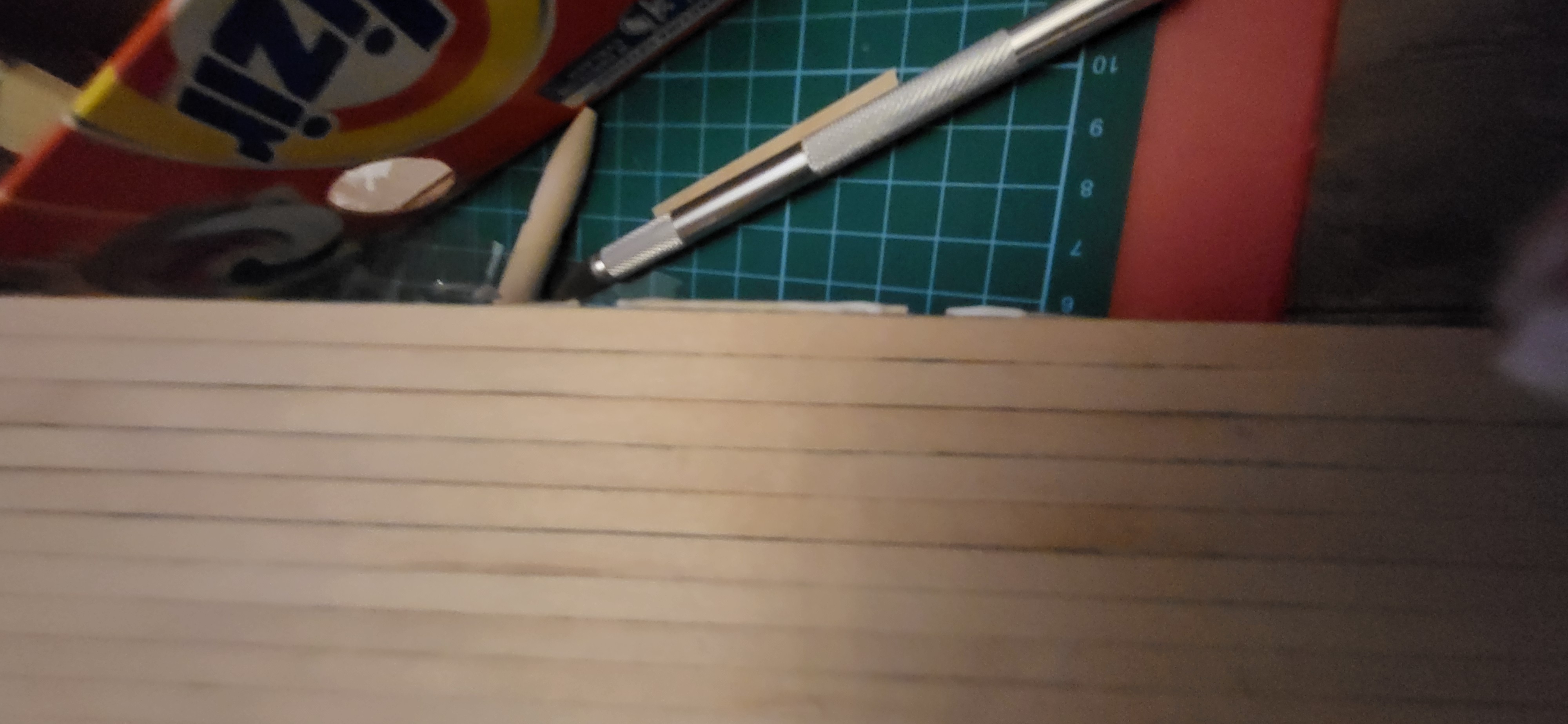 Narazie utrzymuje w miarę kąt, niestety deseczki same w sobie mają wyboczenie i są odchyłki w grubości, będę musiał wszystko zeszlifować na koniec. Ze względu na moją pomocnicę 6 l, zrezygnowałem z kleju kontaktowego modelarskiego, kupilem zwykły do drewna, do użytku wewnętrznego, będzie to trwać dłużej ale nie musze często wietrzyć. Ewidentnie czuję brak doświadczenia i widzę postepy w miarę klejenia to idealny model na pierwszy - narazie