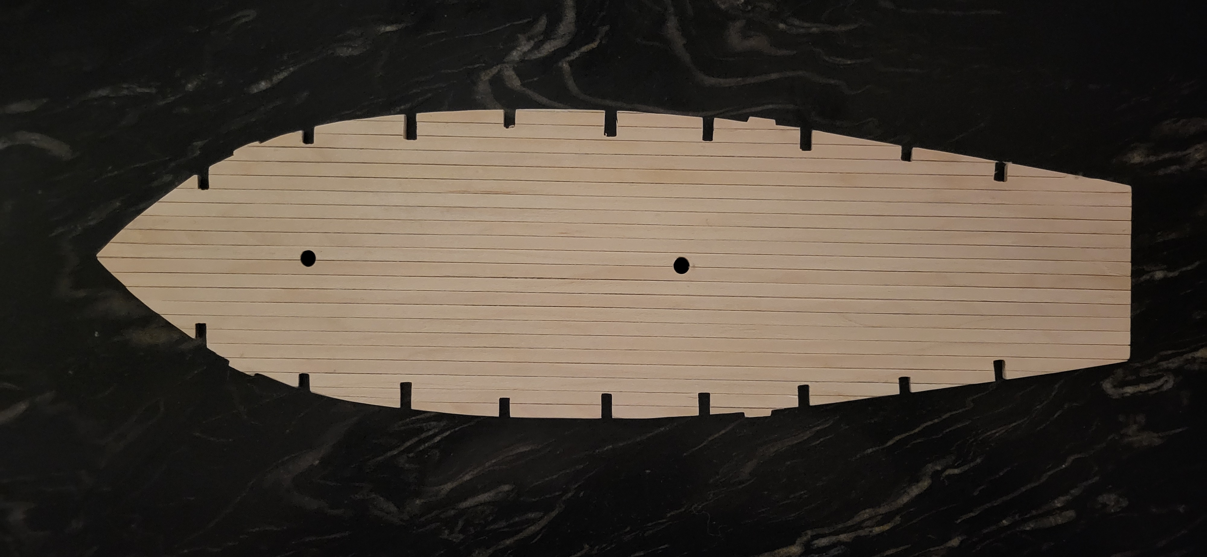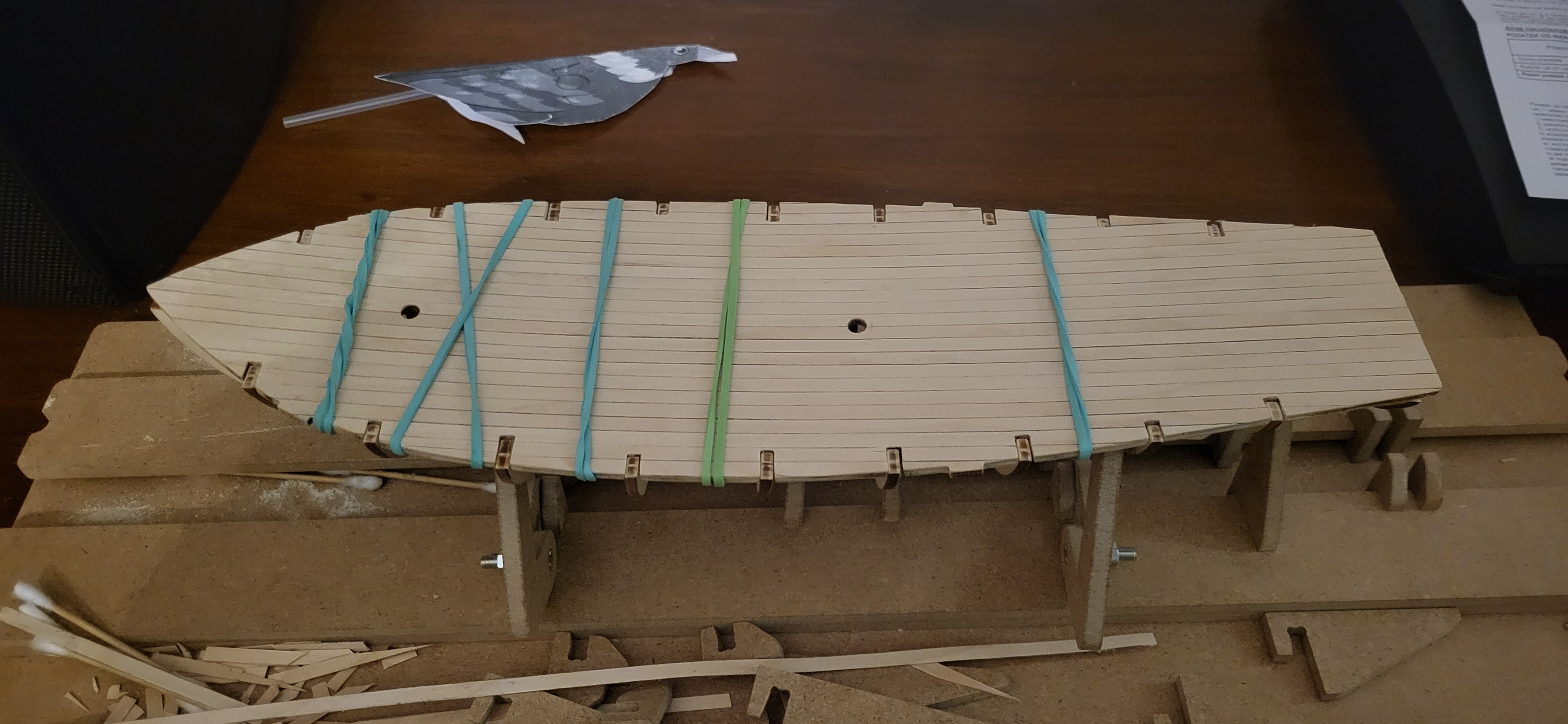 niestety jedna deseczka lekko podłamana, ale wręgi pasują w otwory, jak farba wyschnie przyklejam pokład i szlifuje
