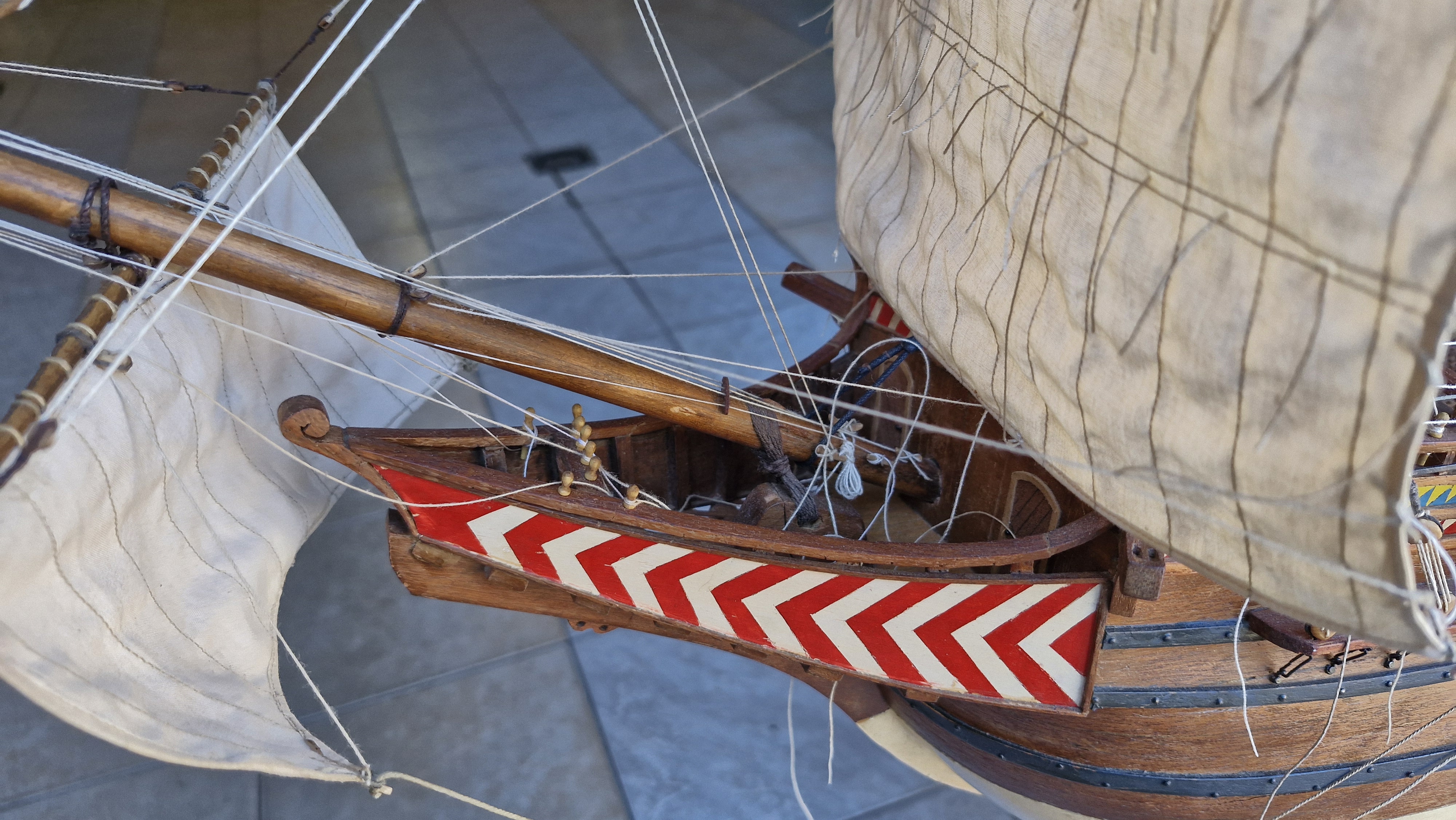 A tu widac dolny odpowiednik - b, tego gornego pachola - a, z ciensza lina obwiazana trzykrotnie wokol niego, wiec przelozenie musi byc duze, ale chyba i tak pewnie wyciagalo ta line kilku marynarzy - jak wspomnieliscie reja musiala byc b. ciezka...