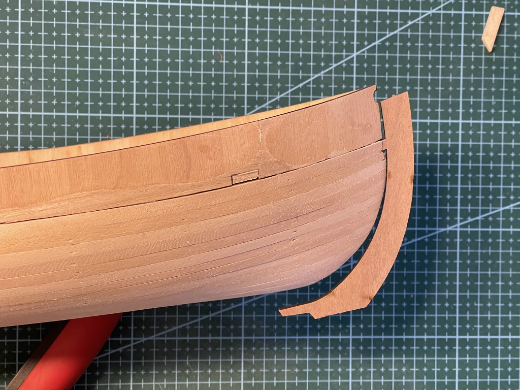Po mojemu wewnętrzny kształt dziobnicy jest prawidłowy i nie jest "babolem". "Babola" popełniłeś Ty. Wewnętrzna krzywizna dziobnicy powinna idealnie pasować do dziobowej krzywizny osiowej podłużnicy. Ty ją plankami poszycia zabudowałeś i dlatego nie pasuje. Teraz musisz na dziobie kadłuba wyciąć szczelinę o grubości dziobnicy, aż do samej podłużnicy. Tam dziobnica ma wejść i prawidłowo pasować. dalsza część kilu i stewy (tylnicy) rufowej też.
