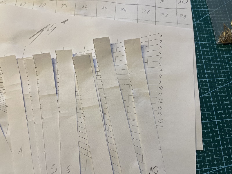 Każda wręga została zmierzona, odwzorowana na pasku papieru, i podzielona na ilość deseczek żeby uzyskać ich wymagane szerokości na wrędze.