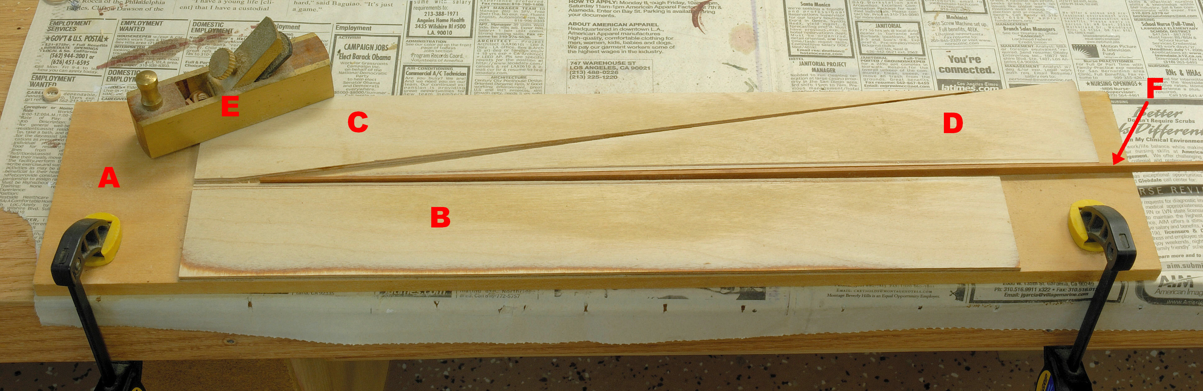 Heblowanie krzywizn na czworokatnych plankach najlepiej jest zrobic na sporzadzonym do tego celu urzadzeniu - imadle ze sklejki z jednym zaciskajacym trojkacie luznym, miedzy ktorym i sasiadujacym czworobokiem (czy prostokatem) - tym przyklejonym do podstawy, zaciska sie luznym trojkatem planke na sztorc (lepiej pare planek na raz dla obu burt) i hebluje sie jej krzywizne - profilowana krawedz do linii wyrysowanej uprzednio w olowku, za pomoca mini hebelka - najlepiej takiego dla lutnikow z firmy Ibex planes lub podobne (na Ebay mozna czasem znalezc tansze uzywane). W lewym gornym rogu rysunku pokazalem zrobione napredce urzadzonko o ksztalcie duzej litery A z rozstawianymi nogami, do rozciecia na pilce tarczowej prostokata na dwa trojkaty do tego imadla.