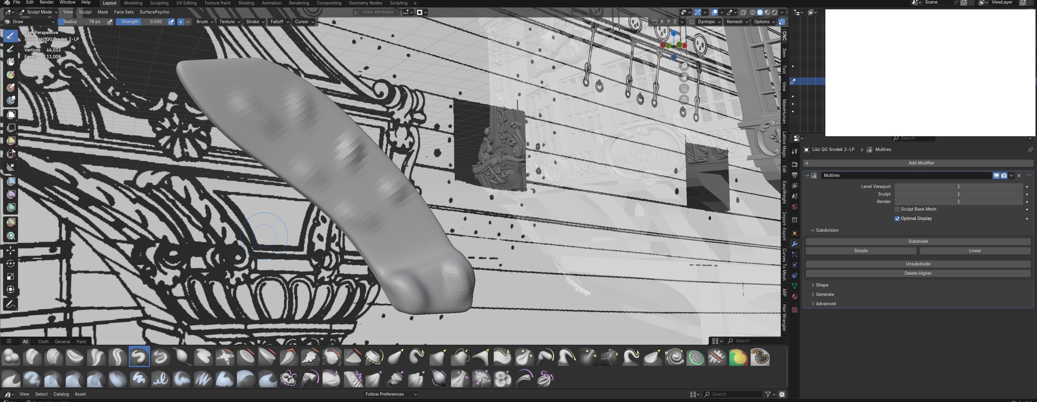 4. Następnie jest to już zabawa w Sculpt Mode. Dodaj modyfiaktor Multiresolution i baw się między dodawaniem szczegółów i tym modyfikatorem. Tylko patrz czy ile chcesz mieć szczegółów w stosunku do objętości pliku