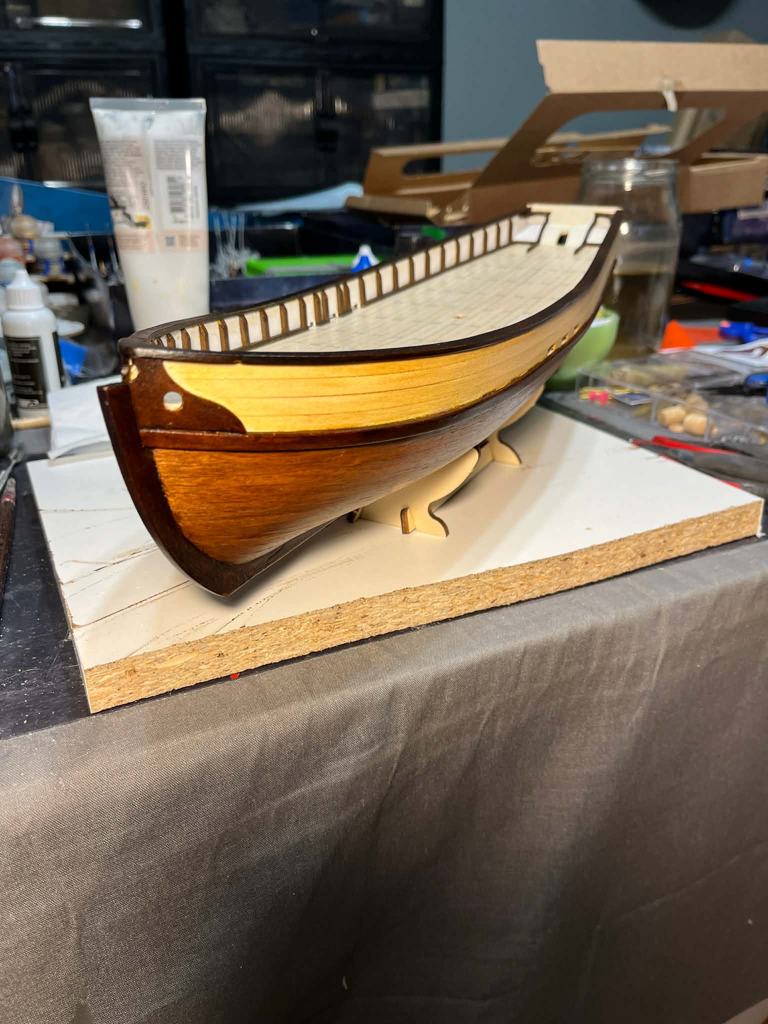 Model Polaris traktuję świadomie jako projekt szkoleniowy – ma on posłużyć przede wszystkim do nauki podstawowych technik pracy z drewnem, poszycia, obróbki detali oraz ogólnego „czucia” tego typu modeli. Zakładam, że nie uniknę błędów i niedociągnięć, ale właśnie na tym etapie chcę je popełniać, wyciągać wnioski i stopniowo poprawiać warsztat, zanim zabiorę się za bardziej wymagające i ambitne konstrukcje. Realizuję go zgodnie z instrukcją producenta, ale też próbuję coś więcej - np. drugie poszycie próbowałem już zrobić bez tych trójkątów zwężając planki.