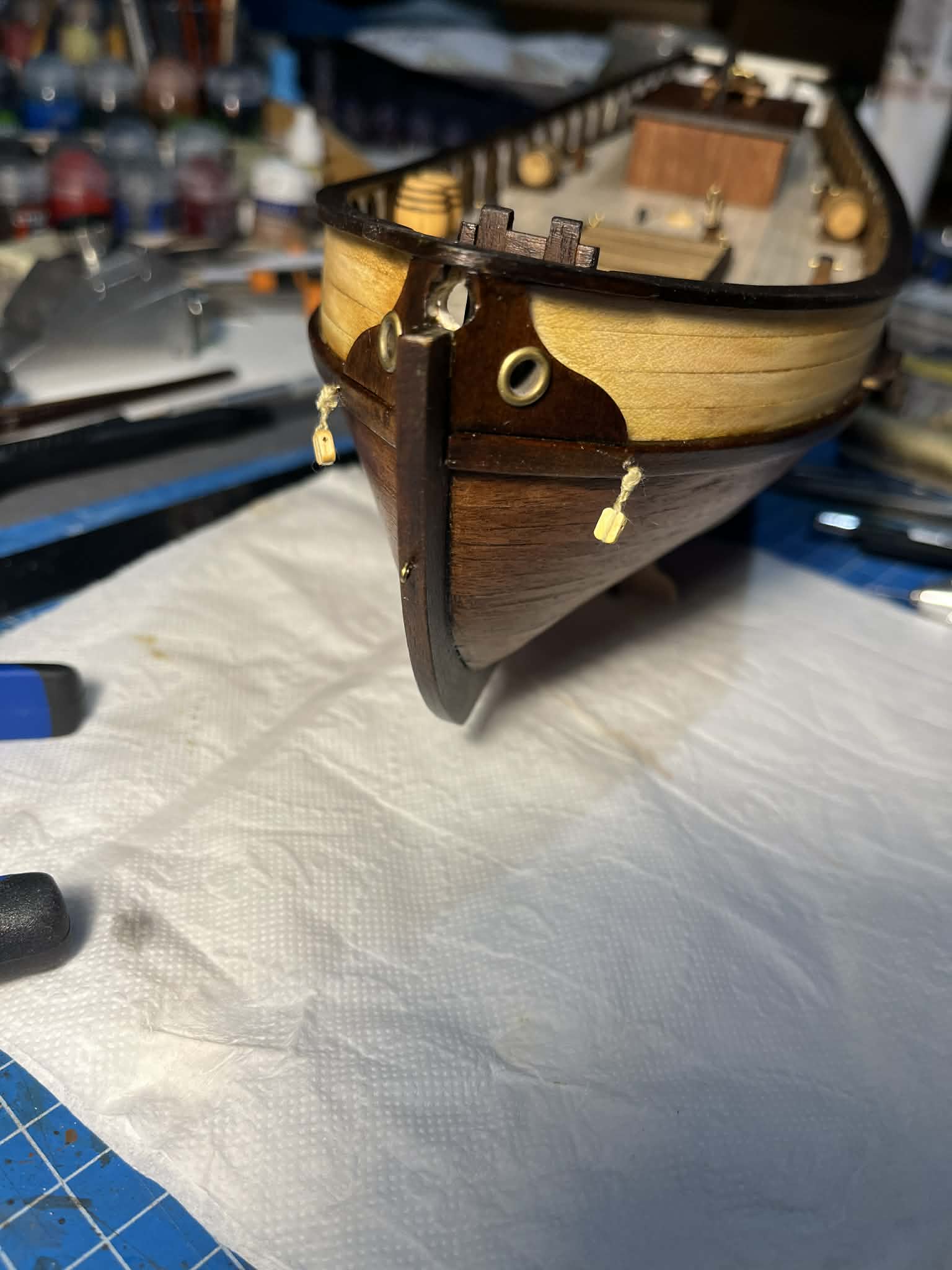 Zeszlifowałem maszty do wymiarów w projekcie, pociągnąłem je bejcą i lakierem matowym. W kolejnym kroku przejdę do wiązania bloczków i dodatków na poszczególnych elementach.