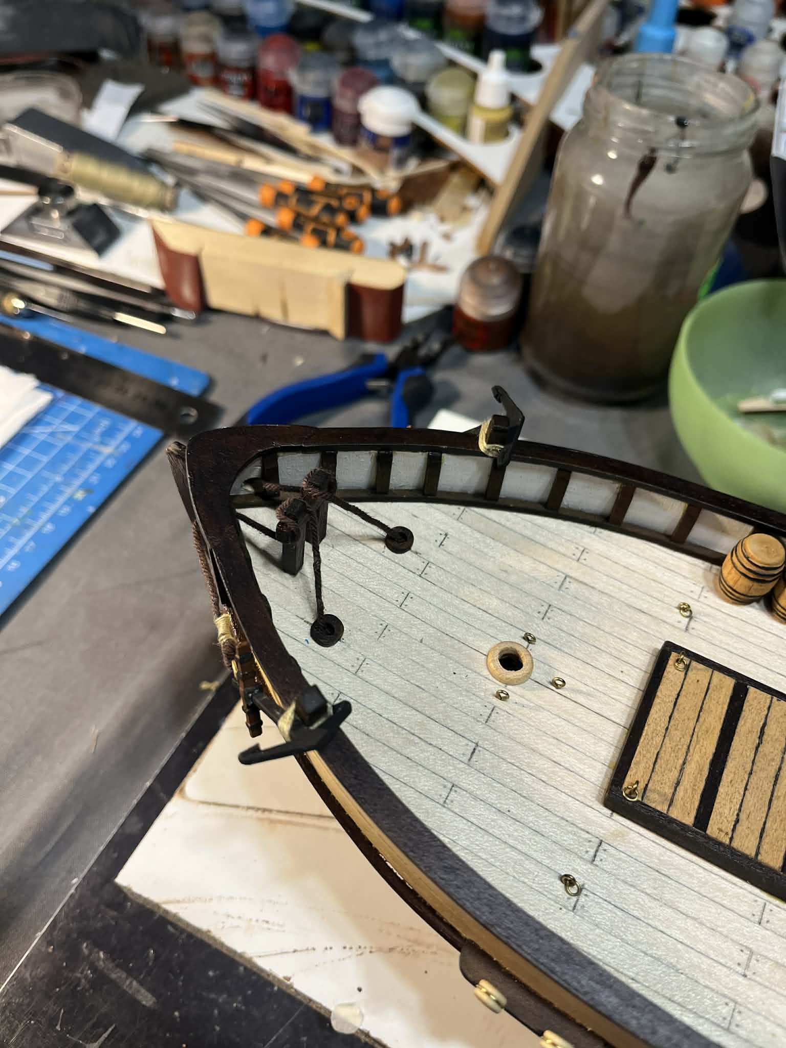 Przygotowałem kotwice zgodnie z instrukcją. Zdecydowałem się dodać kilka dodatkowych elementów - słupki na burtach do mocowania kotwicy oraz przepusty na pokładzie dla lin kotwicy. Nie wiem czy takie rozwiązanie jest sensowne w takiej jednostce, ale jak już to sobie powiedzieliśmy - jednostka fikcyjna, więc puszczam wodze fantazji