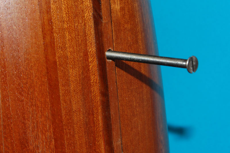 Montaż za pomocą wkręta meblowego jest prosty. Musisz najpierw przymocować po obu stronach otworu w podłużnicy skrawki sklejki. Następnie ustawić wkręt w otworze.