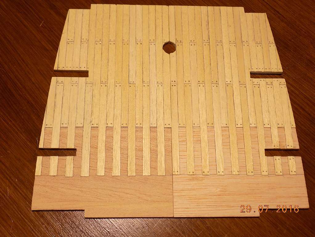 to proponuje zakończyć deskowanie w odległości kilku centymetrów od początku pokładu na dziobie czyli przed łączeniem z elementem 97, a dopiero po wklejeniu tego detalu (97) dokończyć deskowanie. Być może pokład główny nie będzie się idealnie licował z tą "platformą" 97, więc lepiej pozostawić więcej pustego miejsca, aby można było doszlifować którąś z płaszczyzn żeby je wyrównać.