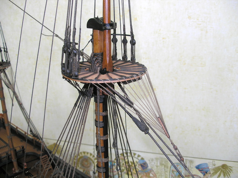 Detal bukszprytu francuskiej fregaty „Belle Poule”. Widać tu jufersy sercowe z rowkami, służące do napinania sztagów fokmasztu.